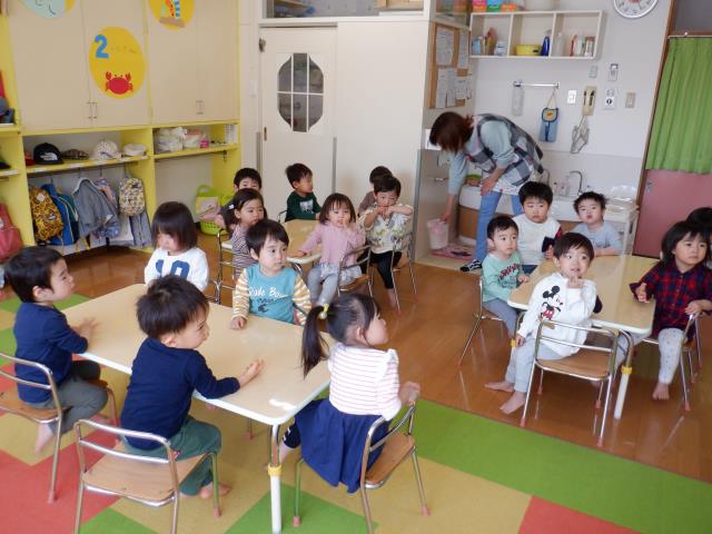 こいのぼりを見て指差しをしたり、大きいクラスのお友達がお散歩に出かけるところを見て、手を振りお見送りをしていましたよ。