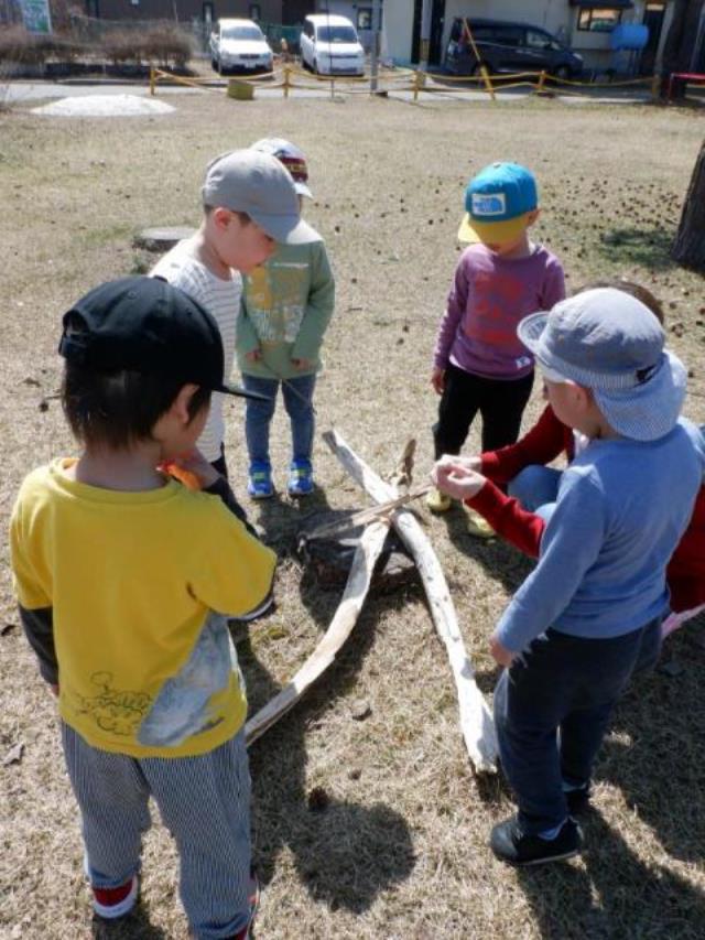 木の枝を集めてキャンプごっこ!原始的な火起こしの仕方を知っているお友達もいてビックリでした。