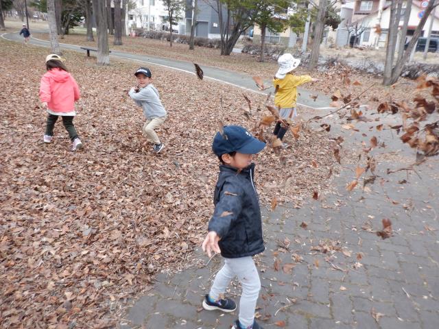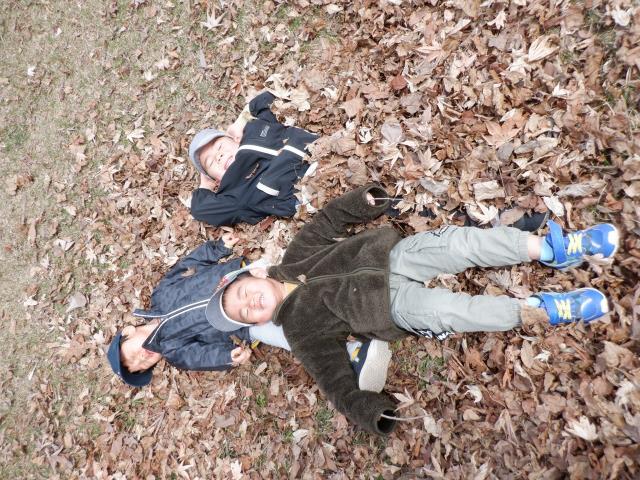松ぼっくりやどんぐりの発見もし、たくさんの落ち葉が風で舞うのも楽しかったようです。