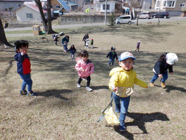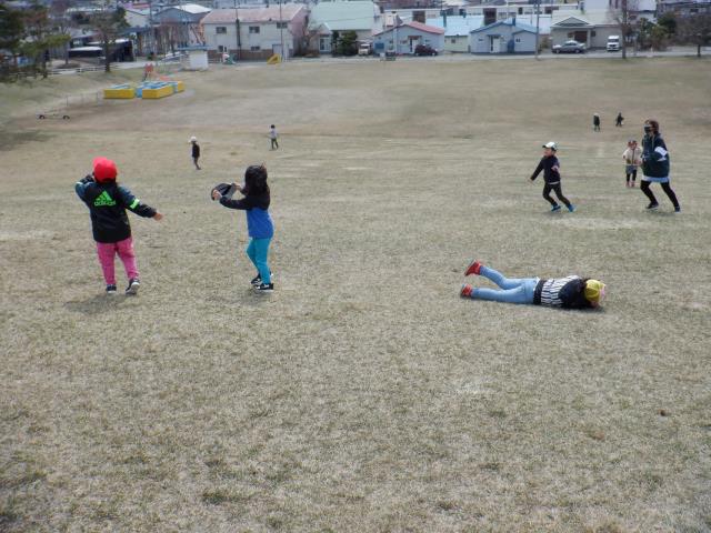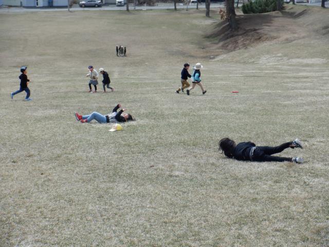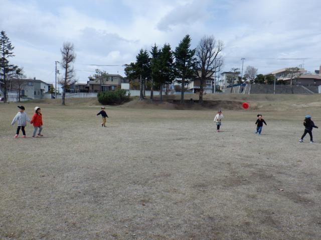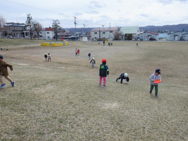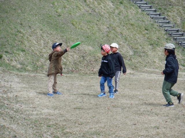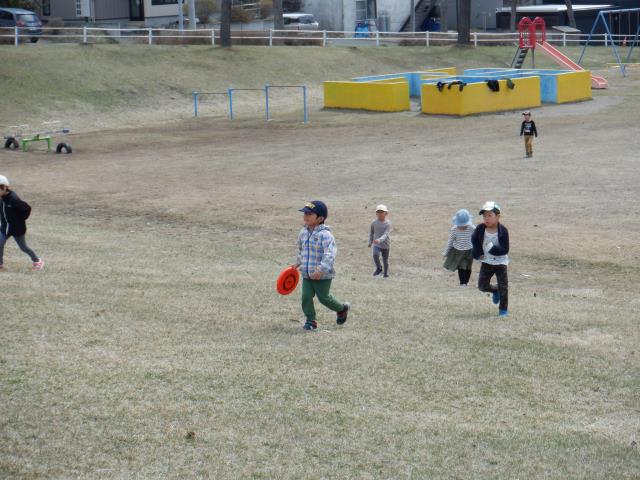 お友達が投げたフリスビーをキャッチしようと頑張ったり、風が強く吹いて色んな方向に飛んでいくことも面白かったようです。時間いっぱい遊んで楽しかったね!