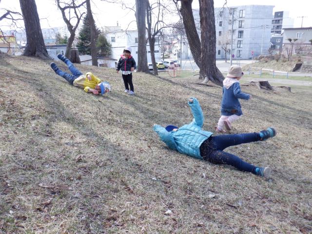 雪がなくなったので、坂から転がって大はしゃぎ!