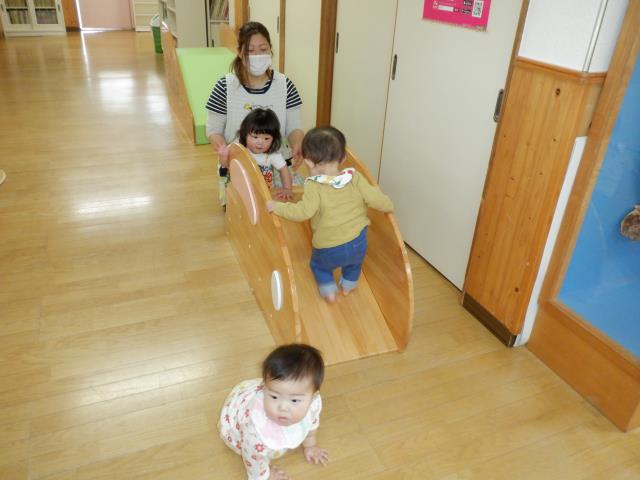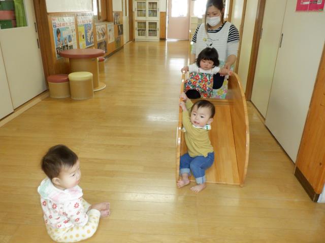 ももさん、遊戯室を自由にハイハイやあんよをした後は廊下にあるすべり台で遊びました。