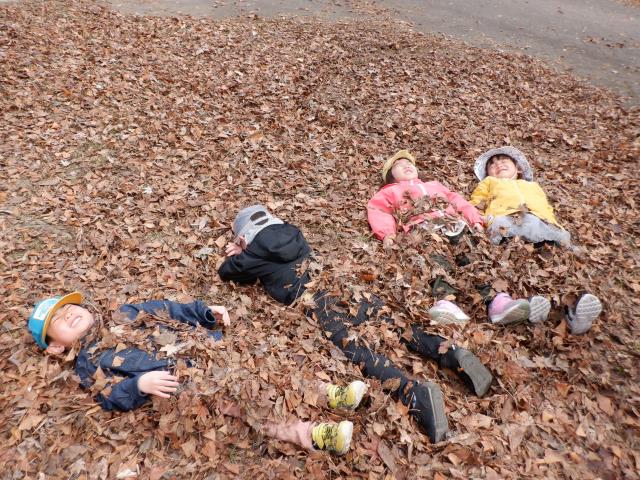 小さな豆を切り株の上に集めたり、落ち葉のお布団で寝てみたりと、満喫したお散歩でした。
