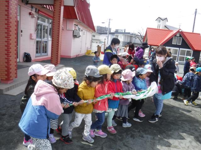 さくらさんが最後に赤ちゃんこいのぼりを運び、全部のこいのぼりが無事にあがると「やった~!」「がんばれ~!」と子ども達から声が聞こえてきました。