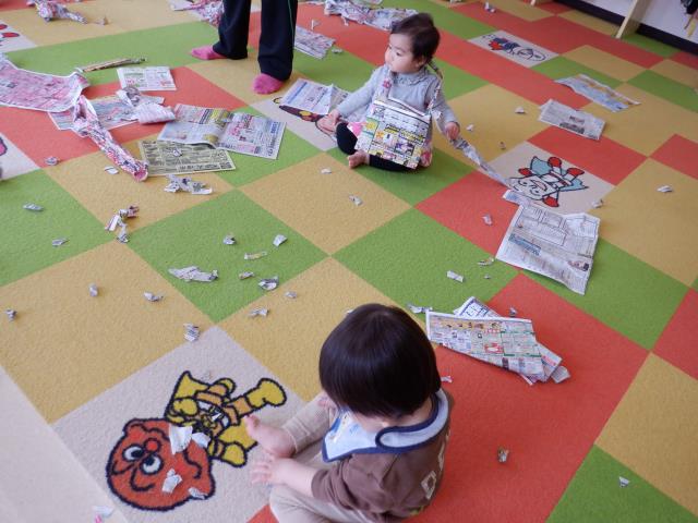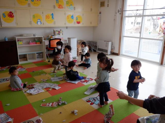 先生の真似をしてビリビリ破いたり、ギュッギュッと丸めていましたよ。