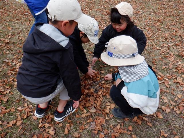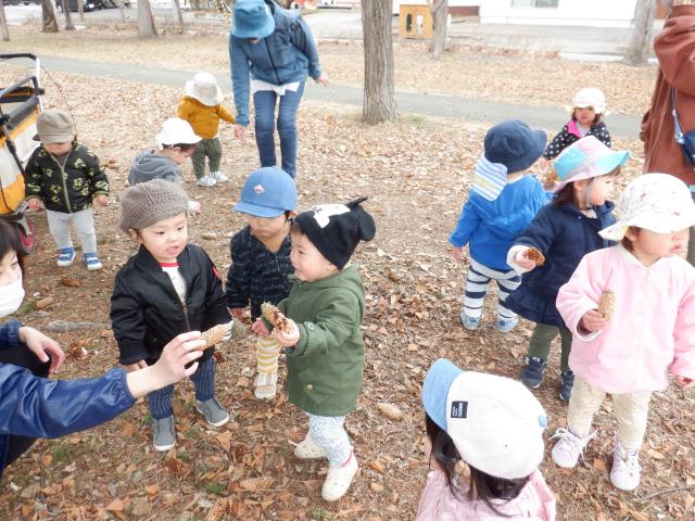 落ち葉を集めてたき火ごっこをし、長い松ぼっくりを焼き芋に見立てていました。