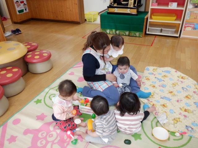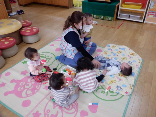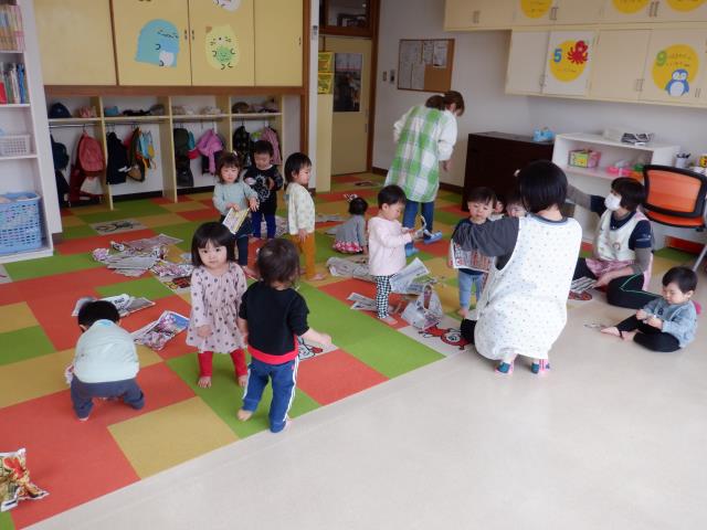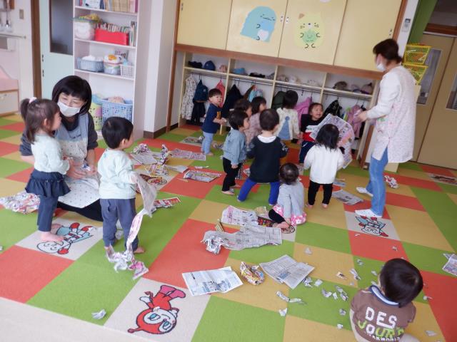 新しく入ったお友達も少しずつ慣れ、笑顔がみられてきました。今日はお部屋で紙遊びをしたちゅうりっぷさん。