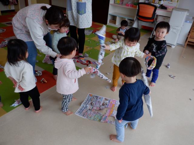 チラシに穴を開けて顔を作ると、丸めた紙をぶつけて倒そうと挑んだり、紙の棒でやっつけている逞しいお友達もいました。