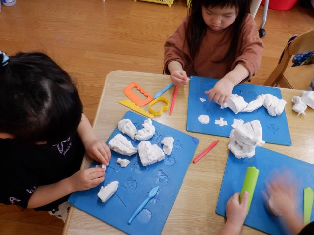 粘土の器の中にラーメンを作って入れているお友達、型抜きを楽しむお友達と、それぞれ道具や指先を使って時間いっぱい楽しんでいましたよ。
