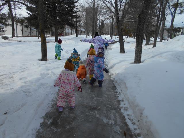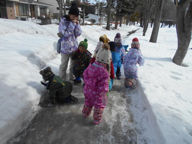 歩く道がツルツルに凍って、スケートリンクみたいになっていてそれも楽しい!