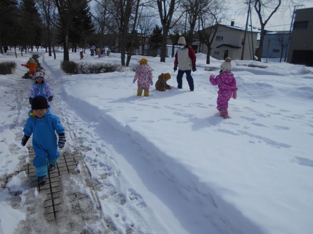 あんなにたくさんの雪があった公園も、雪解けしていてスケートリンクのようになっていました。