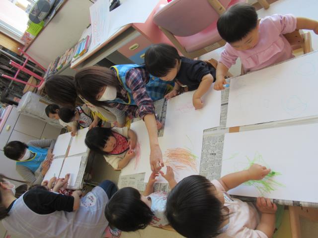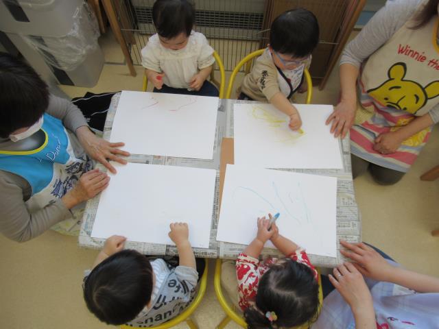 ももさん、クレヨンで自由にお絵かきをしました。