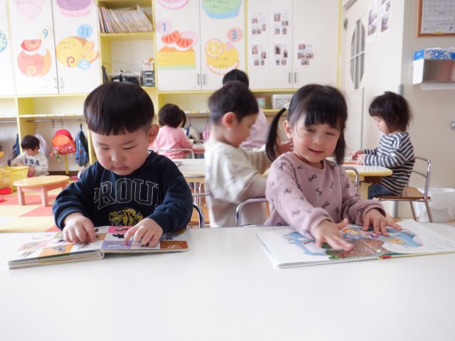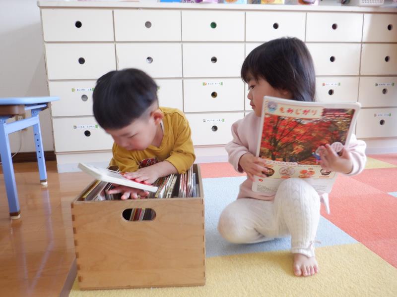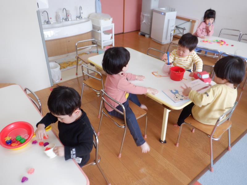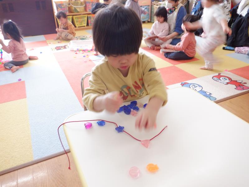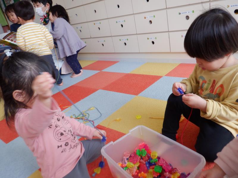 絵本、ひも通し、おままごと。