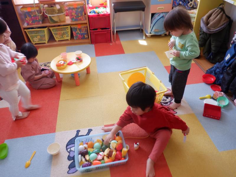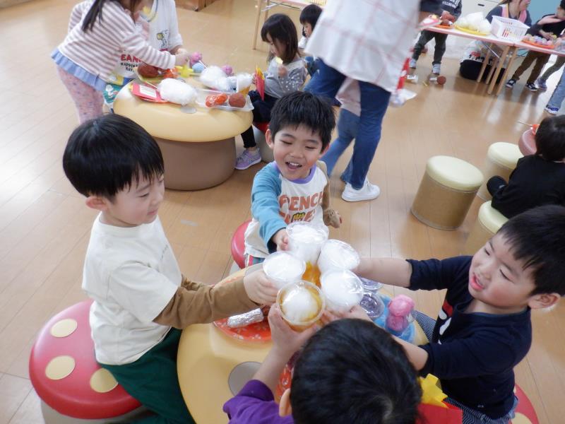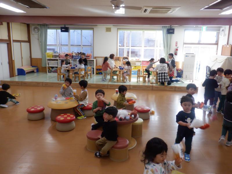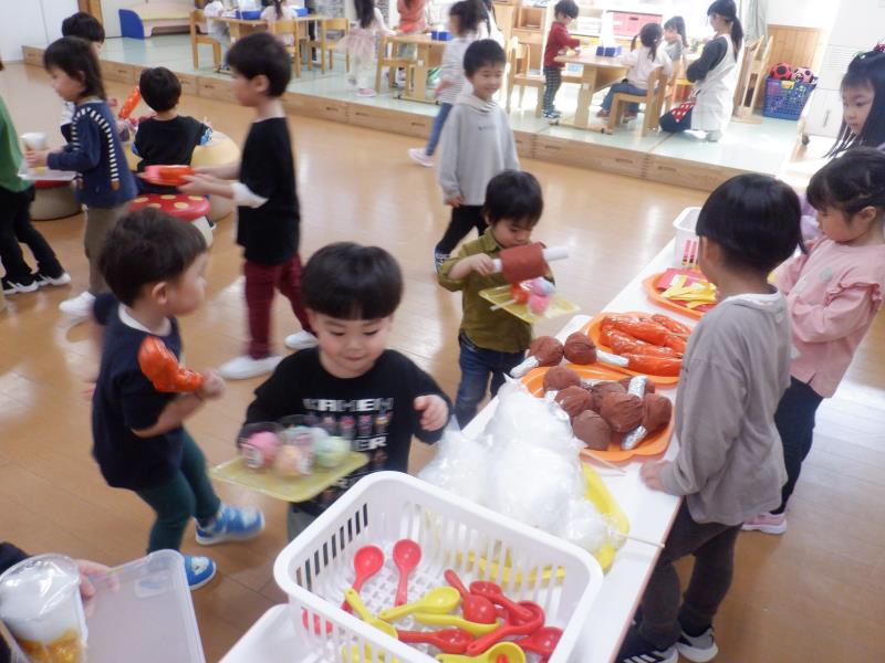 お遊戯室に集まって、楽しい楽しいごっこあそびが