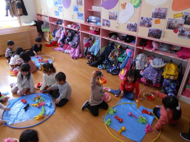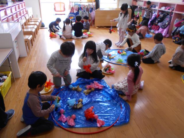まぐろ、さんま、さば、しゃけ、たこ、ジンベイザメなど子ども達が色々な魚に見立てていましたよ~!