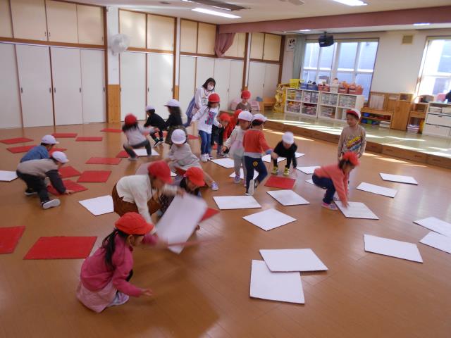 紅組白組にわかれてカードをめくり、自分のチームの色にひっくり返していきます。