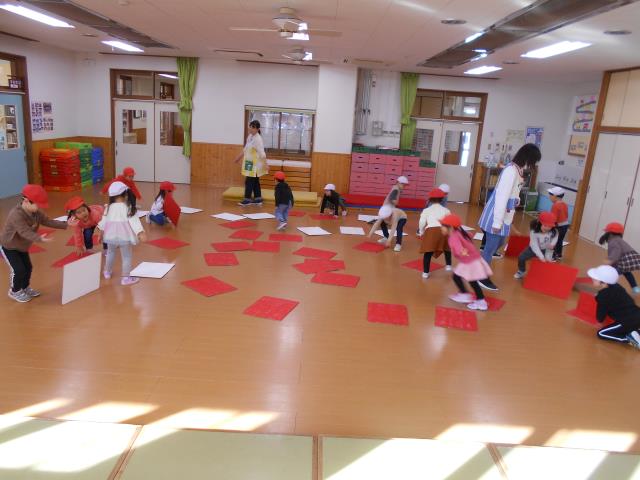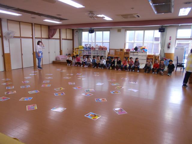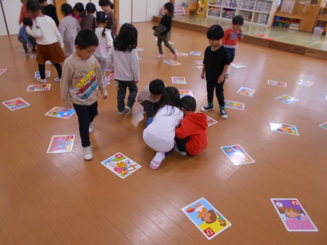 さくらさん、お遊戯室で大型カルタ取り大会!取れた時は嬉しそうでした♪