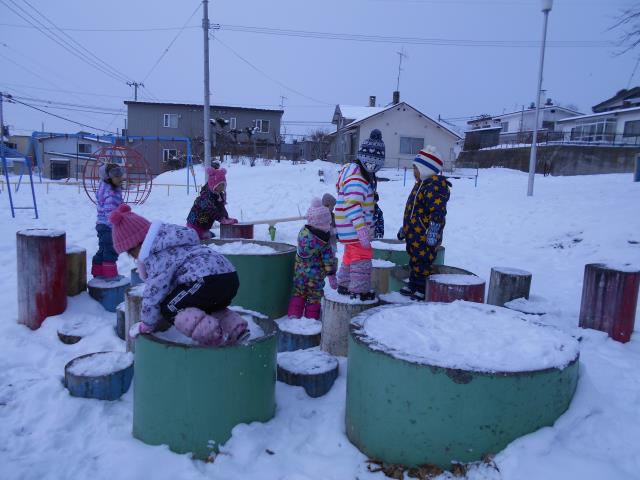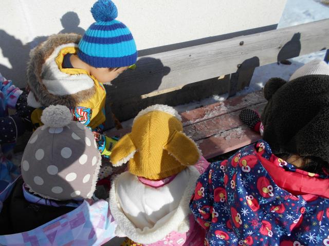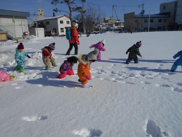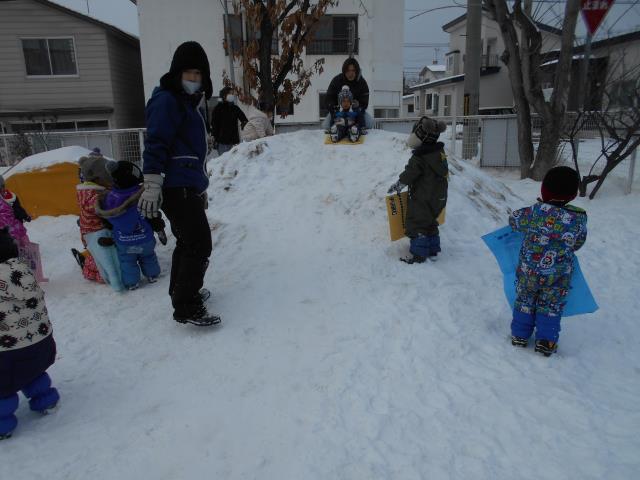 園庭で氷の宝探しも楽しみ、その後はお山からのおしりすべりもしました♪