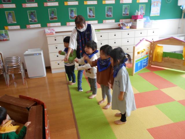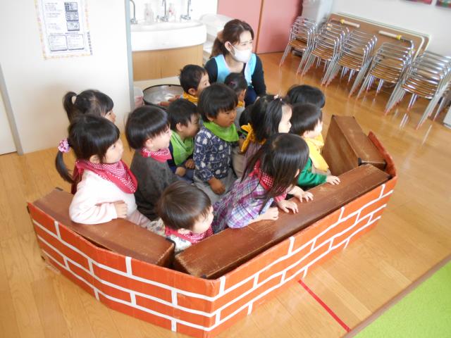 たんぽぽさん、お部屋で「3びきの子ブタ」ごっこをしました。