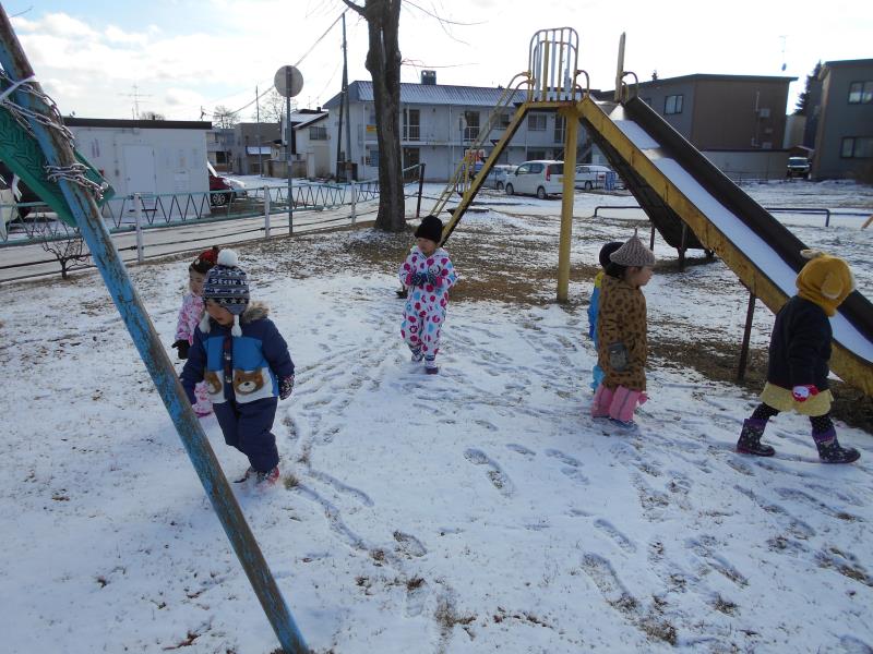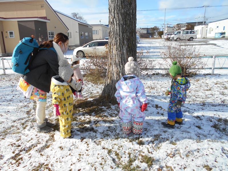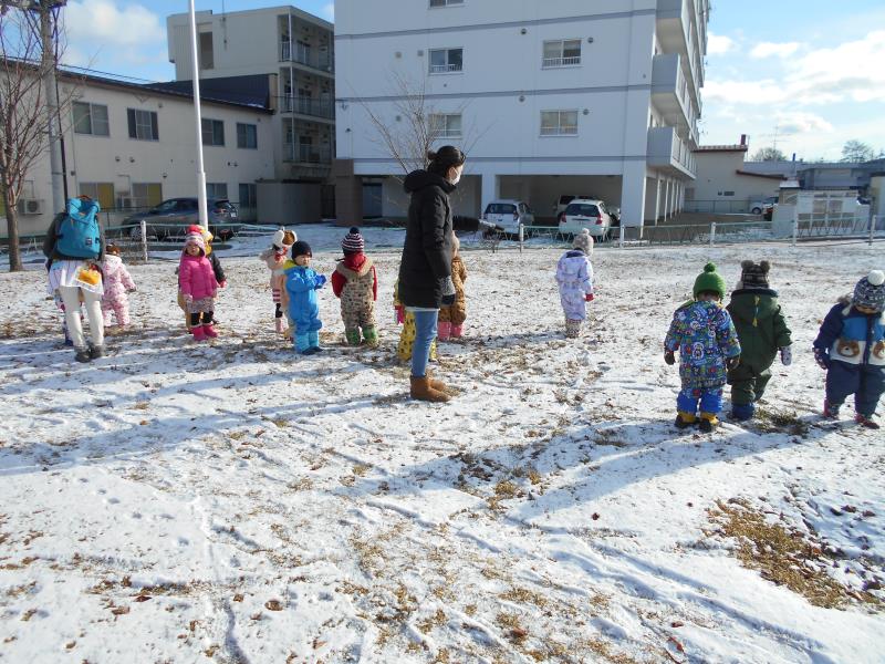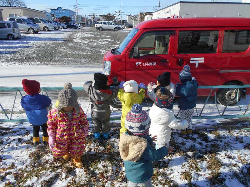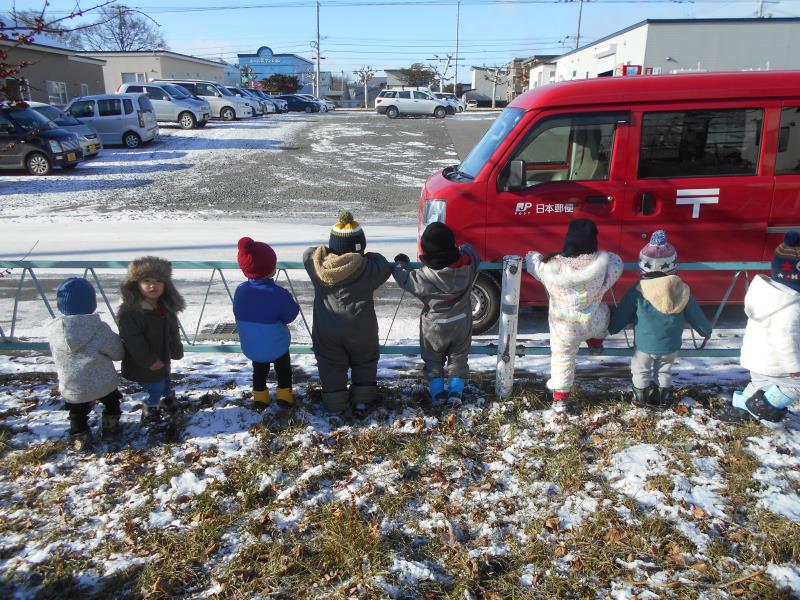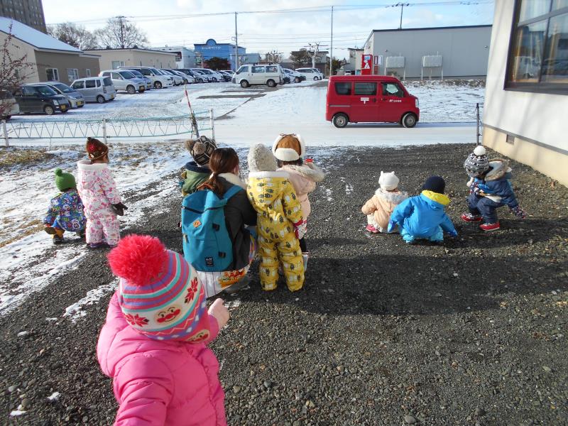 雪が少し積もっていたので雪を上から降らせてみたり、郵便車が停まっているのをみんなで興味津々に見たりと、楽しいお散歩になりましたよ♪