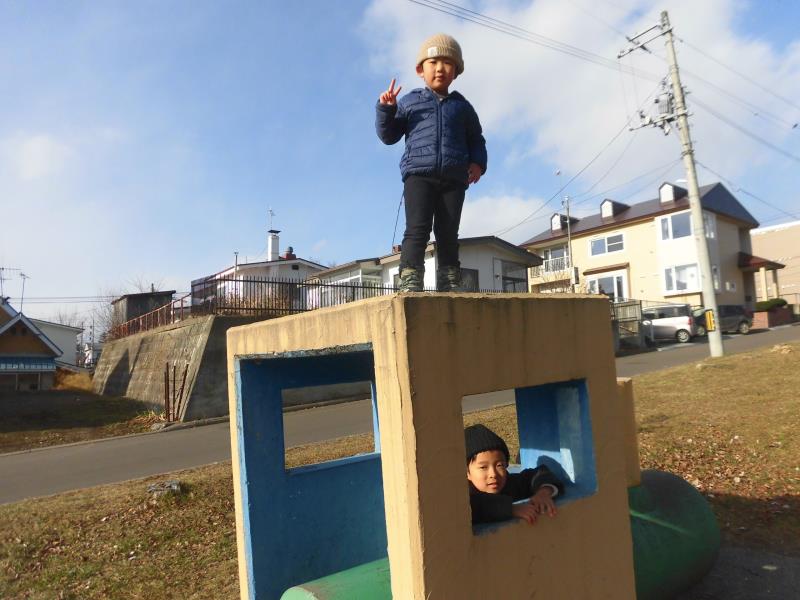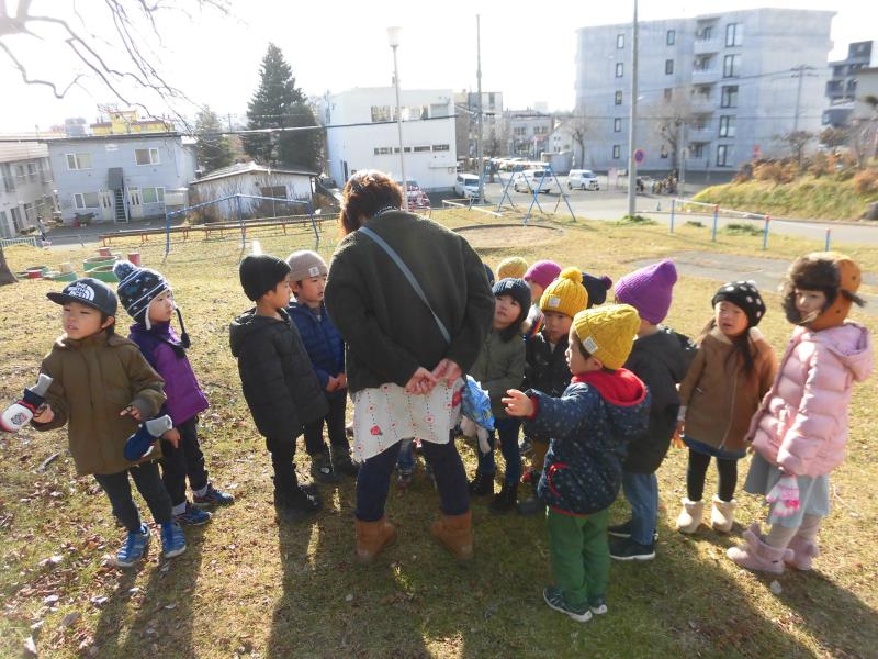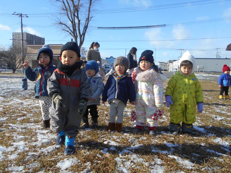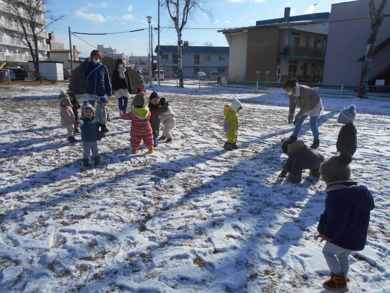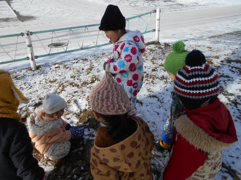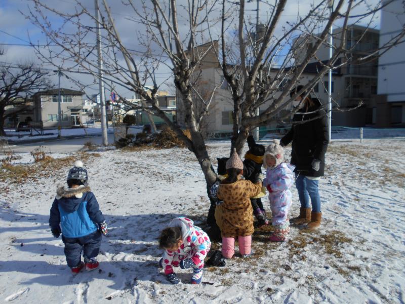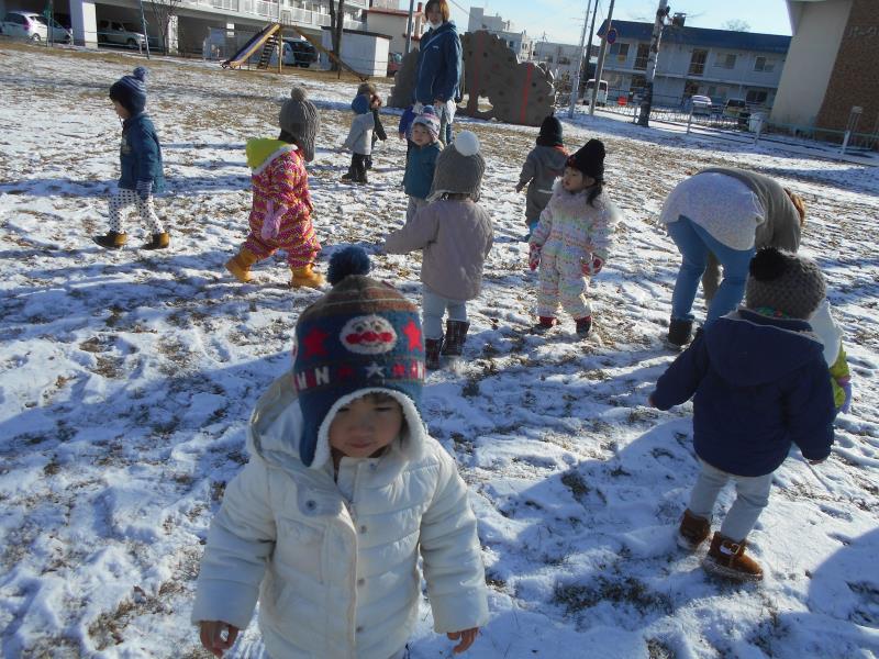 雪が少し積もっていたので雪を上から降らせてみたり、郵便車が停まっているのをみんなで興味津々に見たりと、楽しいお散歩になりましたよ♪