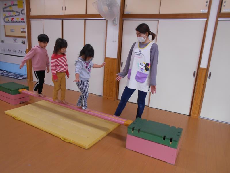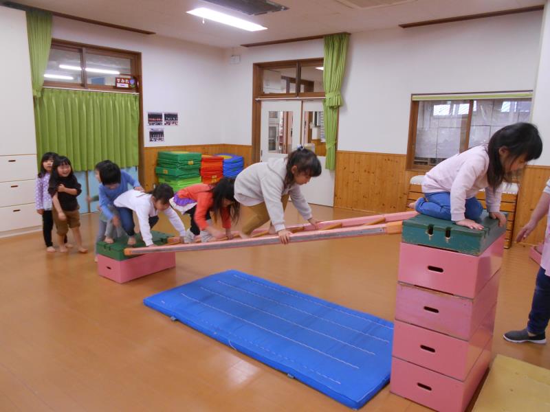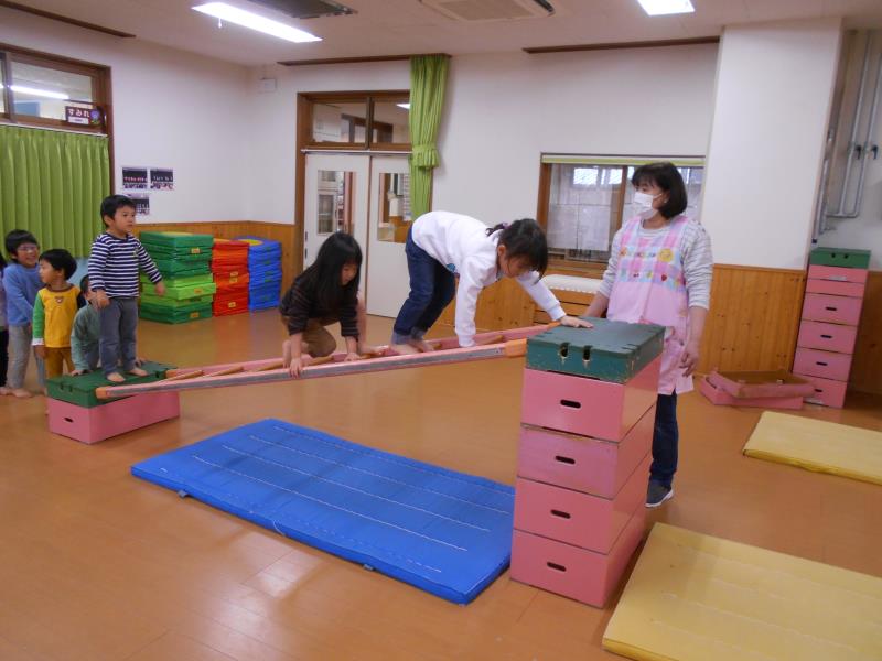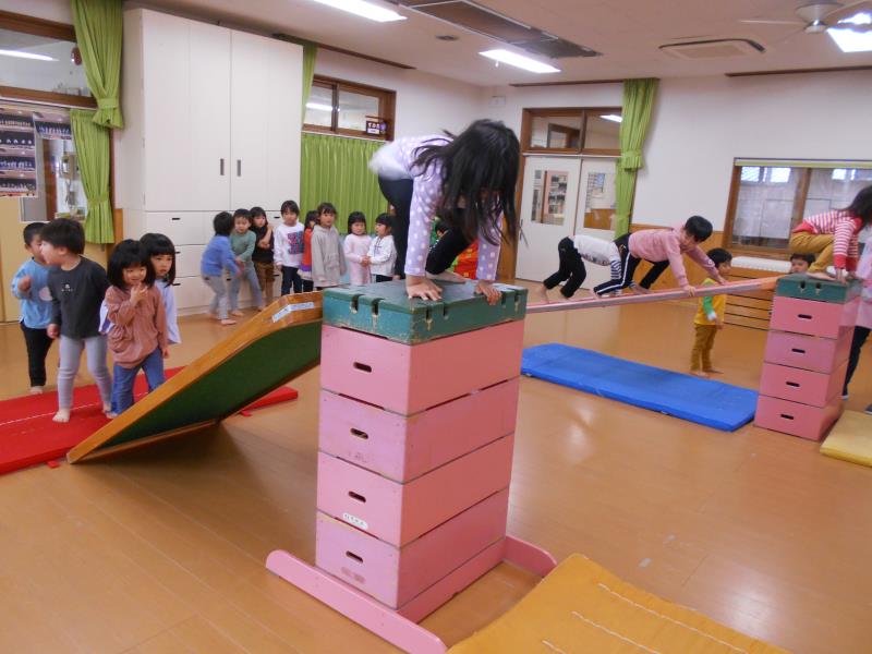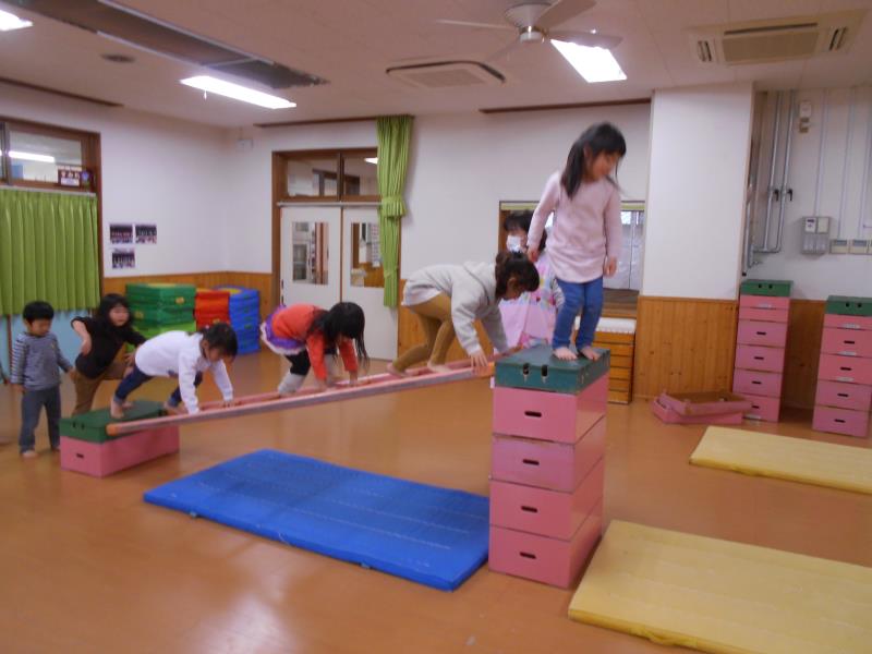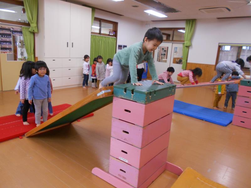 踊りやリズム遊びで体をたくさん動かし、その後ははしごや板上り、ジャンプに平均台をしました!
