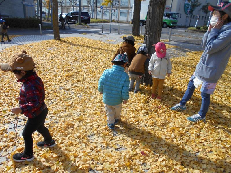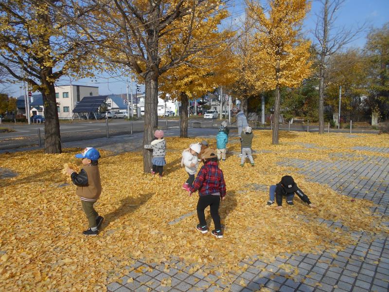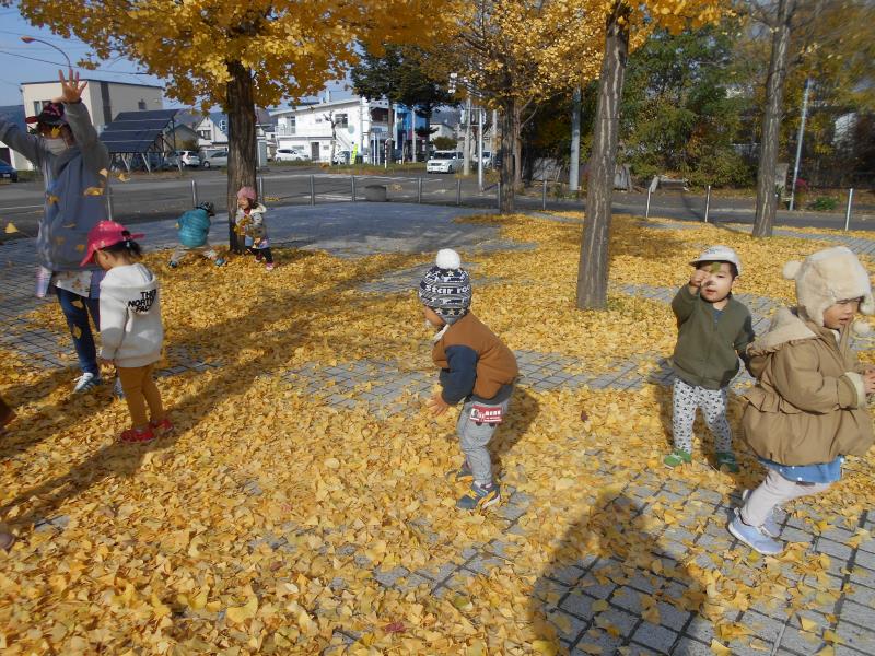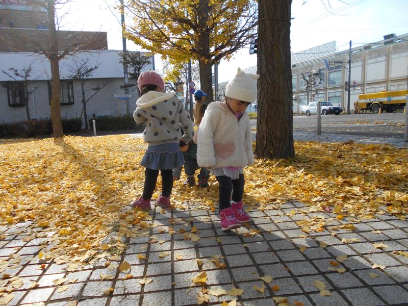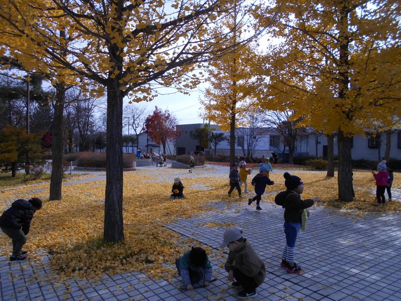 とってもきれいな黄色のイチョウで、落ちているイチョウを集めて先生やお友達とかけ合いっこ♪