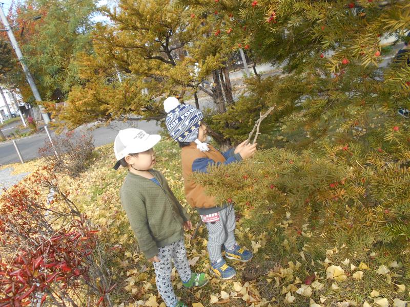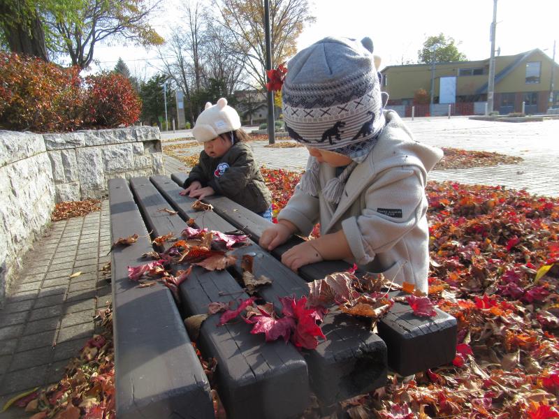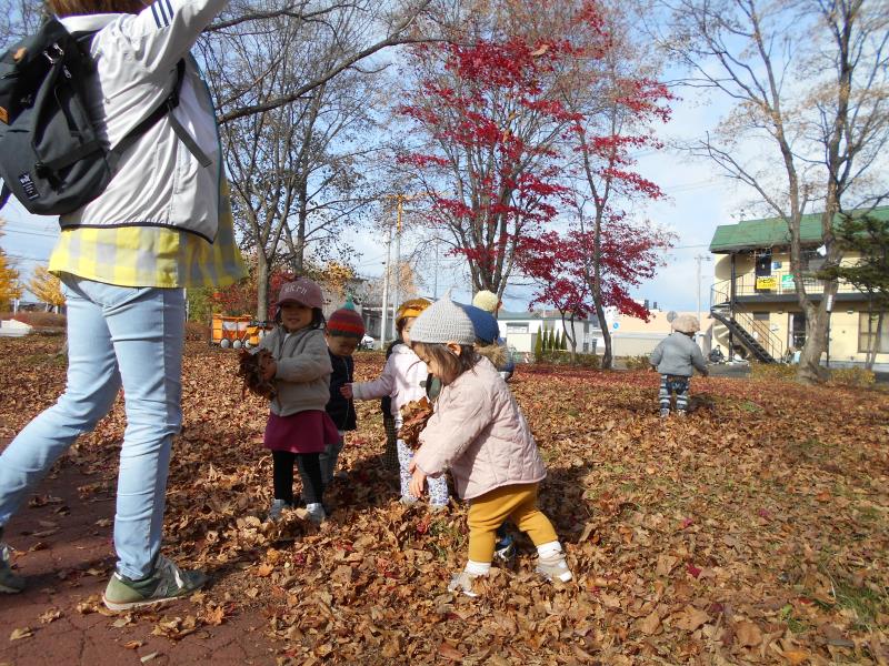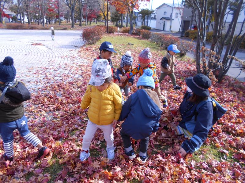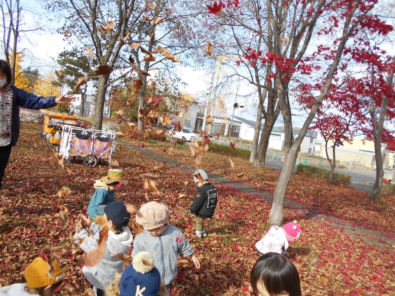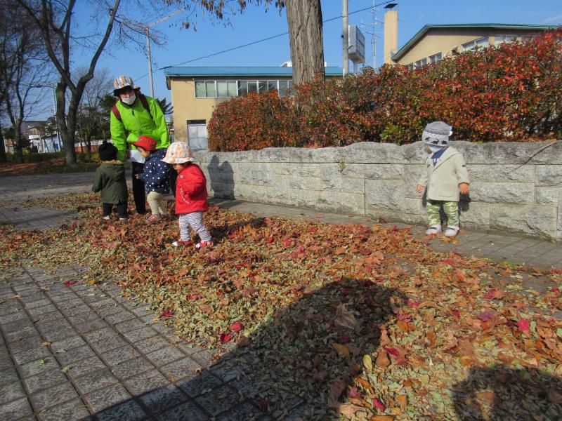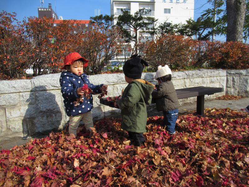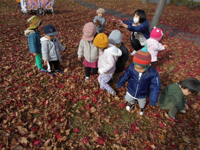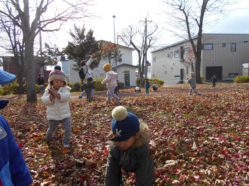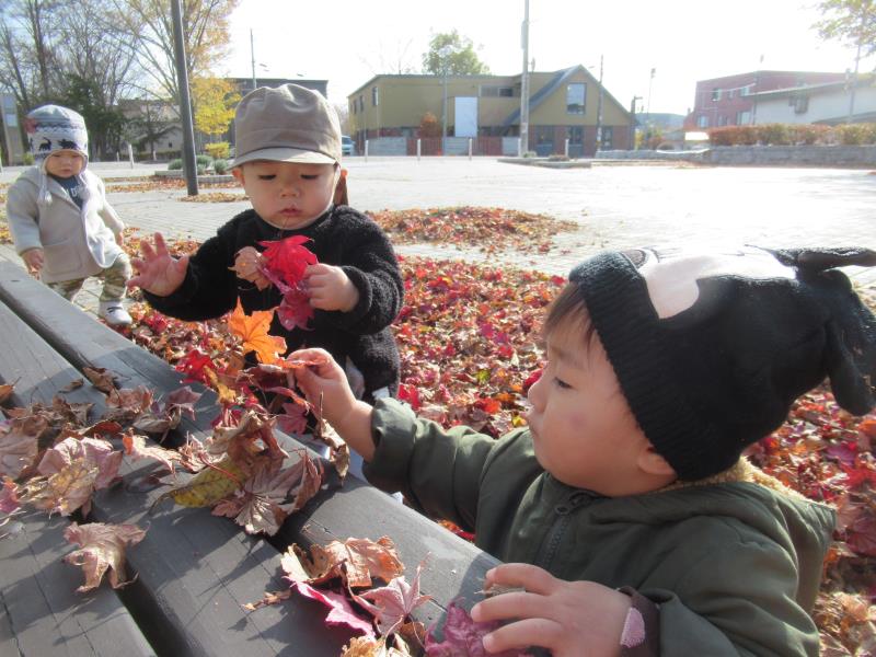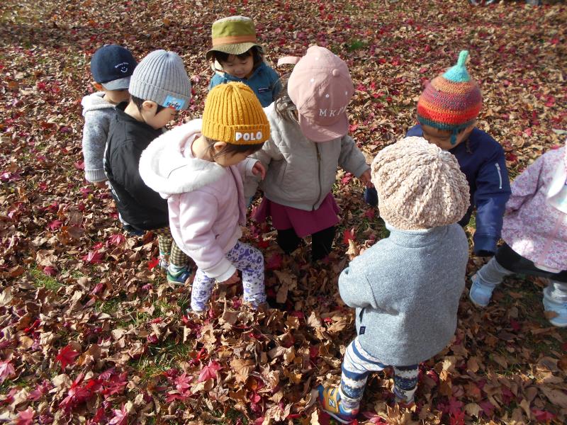 落ち葉の上をカサカサ歩いたり、自分から手に持ち遊ぶ姿もみられました。葉っぱの感触を楽しんでいるようです。