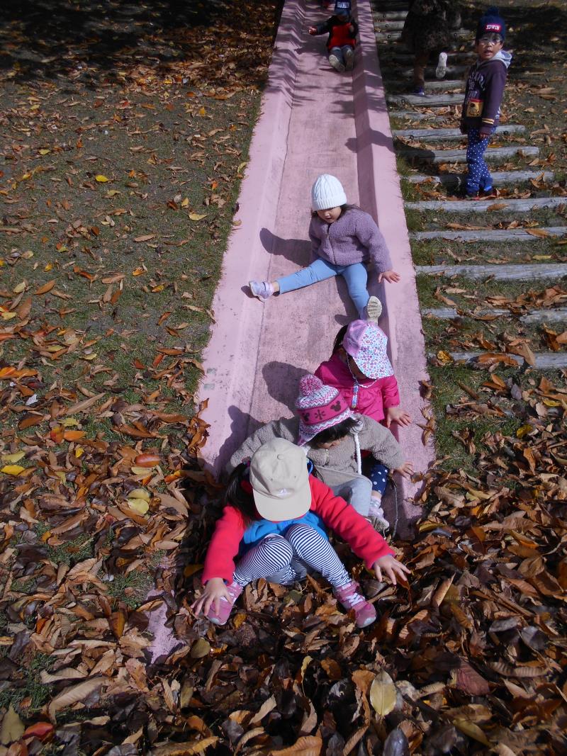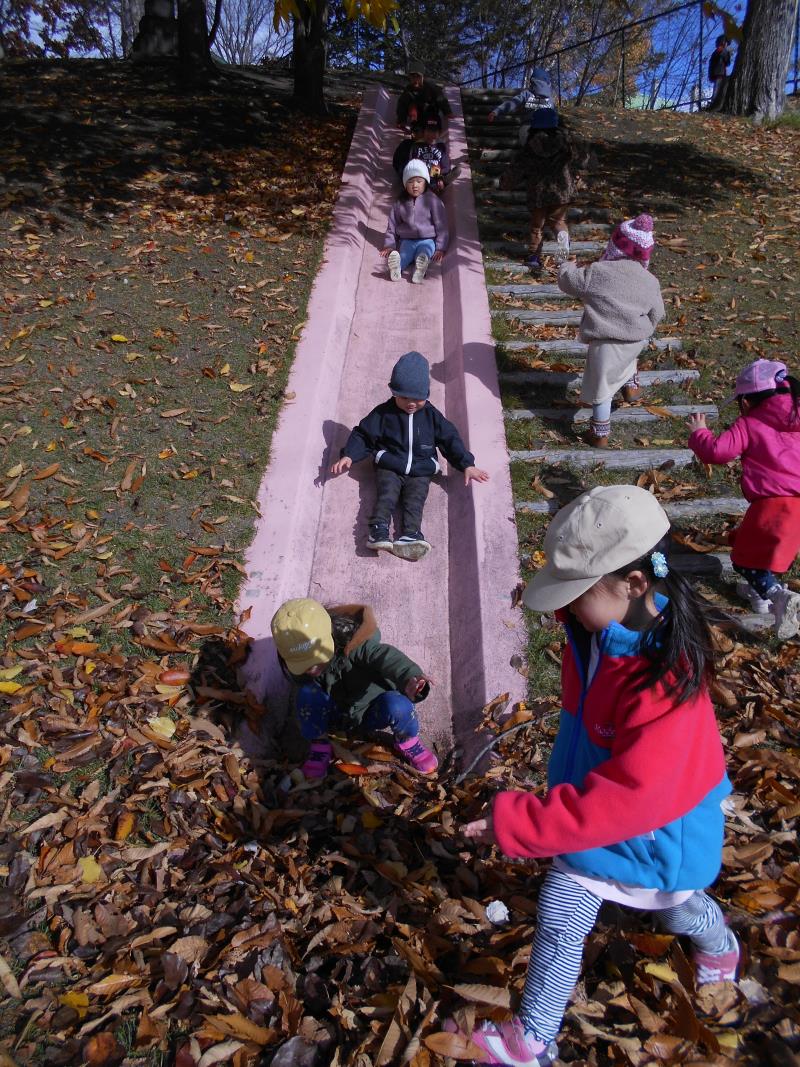 滑り台をすべって、落ち葉の中へ!