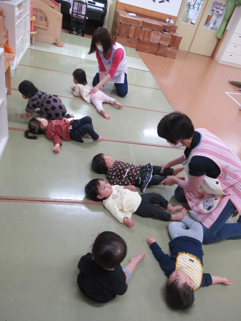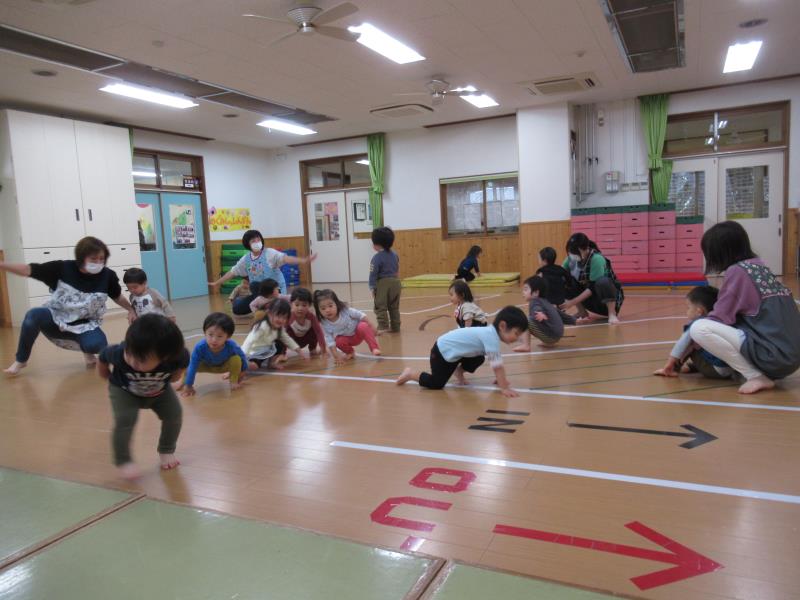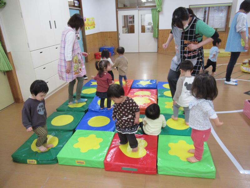 ももさんとちゅうりっぷさん、一緒にお遊戯室でリズム遊び。