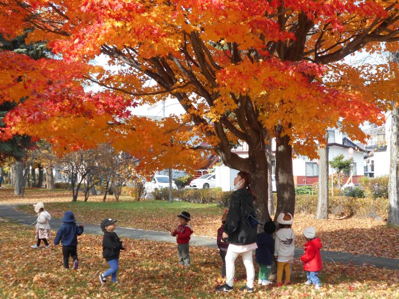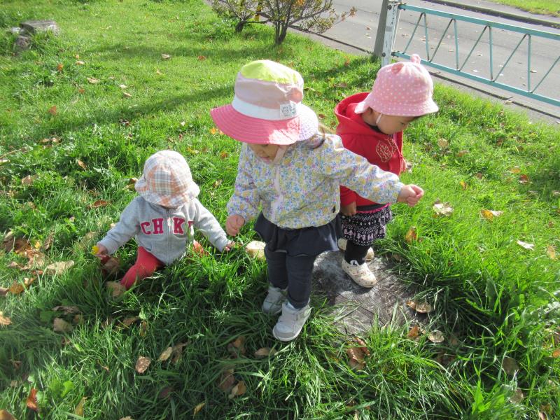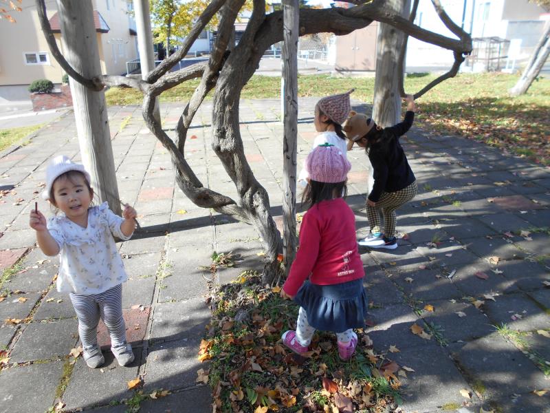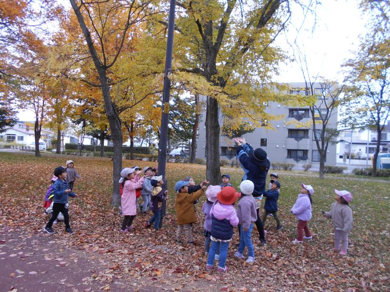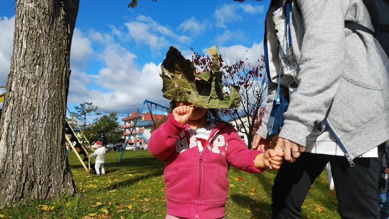 きれいな落ち葉もいっぱい!かけ合いっこや、顔よりも大きな葉っぱも見つけてきました。楽しかったね♪