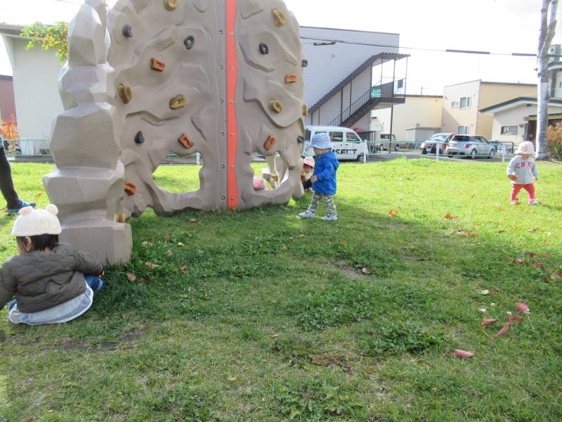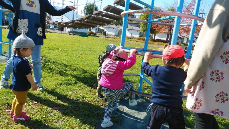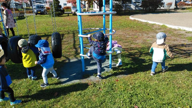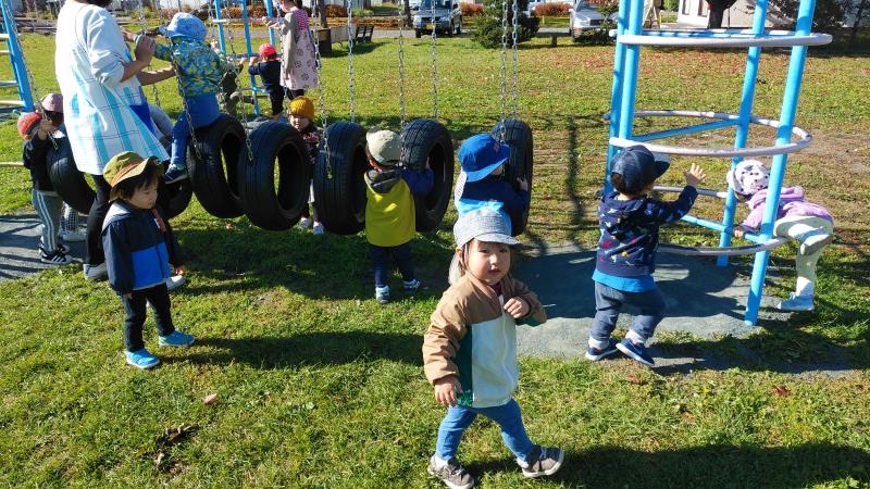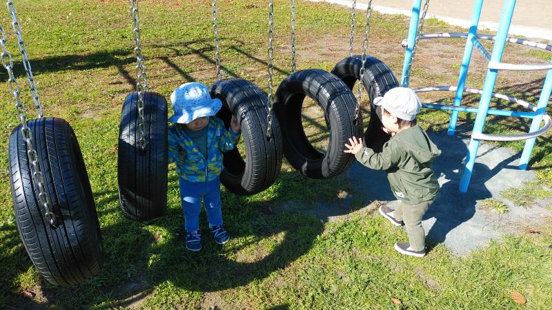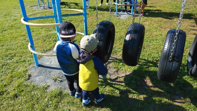 タイヤブランコをゆらゆら押したり、頑張って遊具に上ろうとするたくましい姿もみられました。