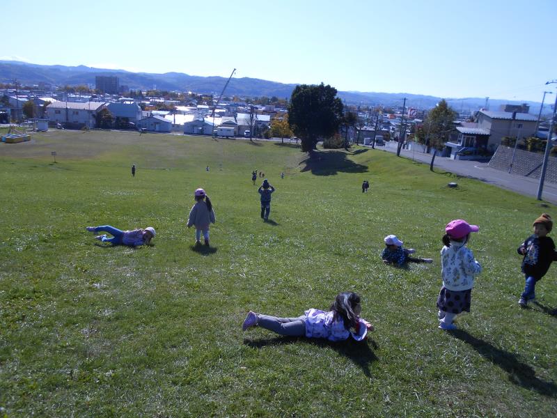 大きな坂から転がり、楽しそうな笑い声が響きます。
