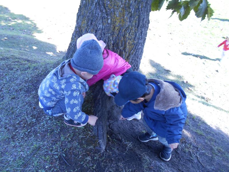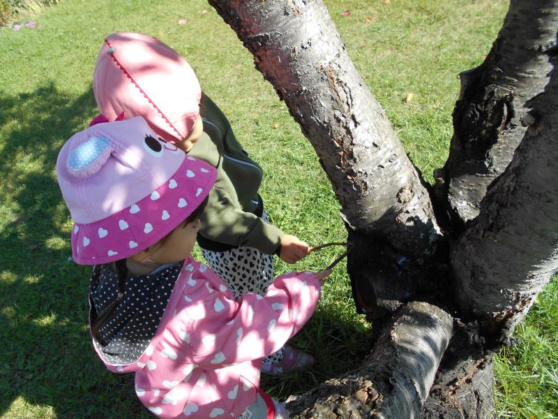 広々した空間で体を動かしたり、樹液を棒でツンツンしたり、またまたきのこを発見!