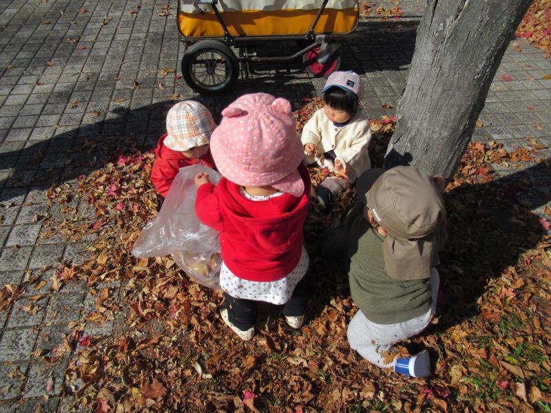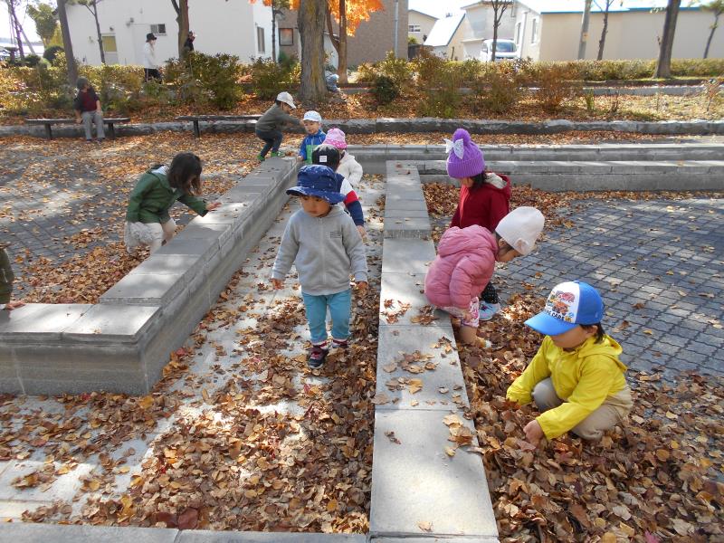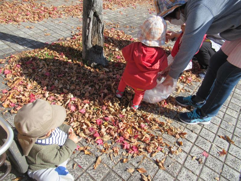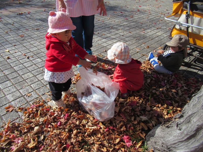 小さく可愛いおててで、袋に落ち葉を入れていました。