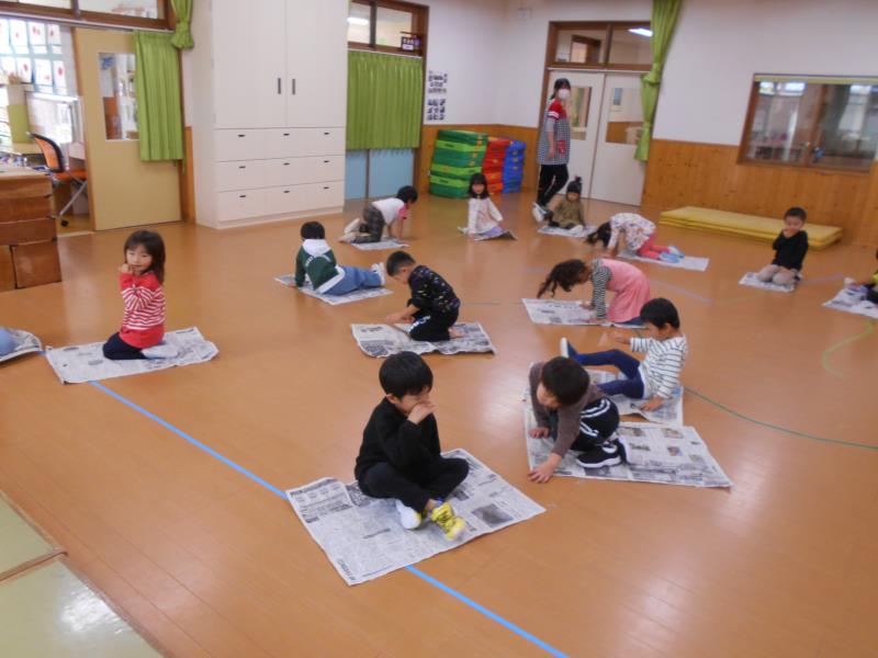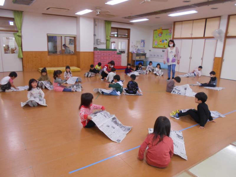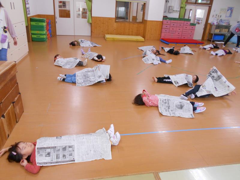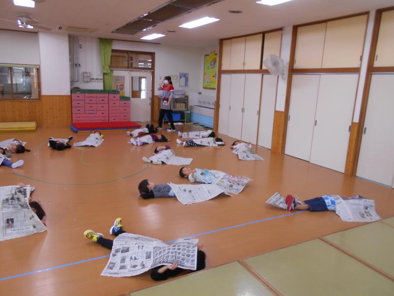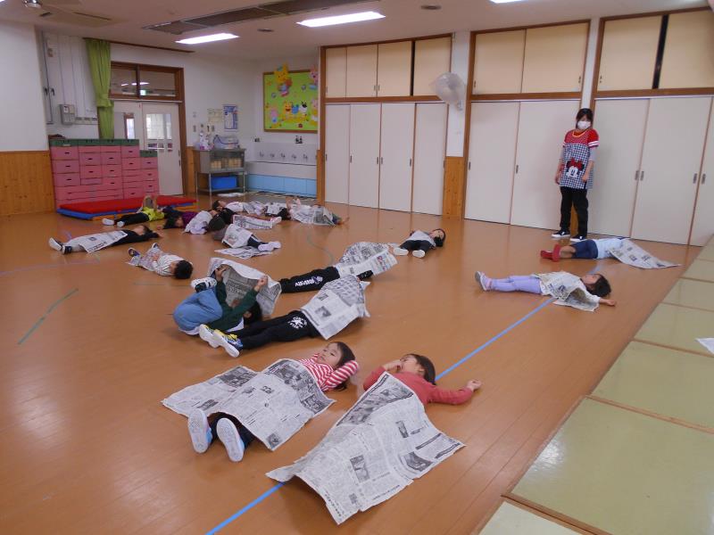 新聞紙を広げて周りを走り、先生が「ふとん!」と言ったら新聞紙をかけて眠り、「ざぶとん!」で座り、「こたつ!」で足にかけていきます。