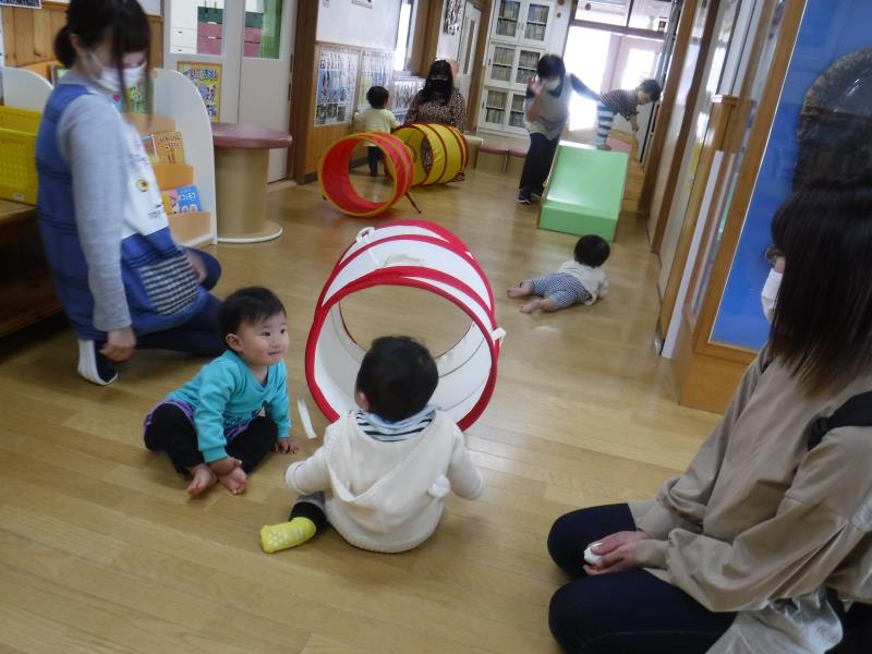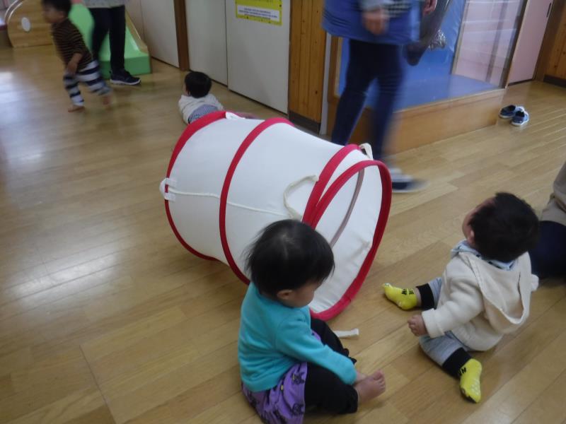 もも組さんが廊下でトンネル遊びをしていたので、一緒に遊びました。