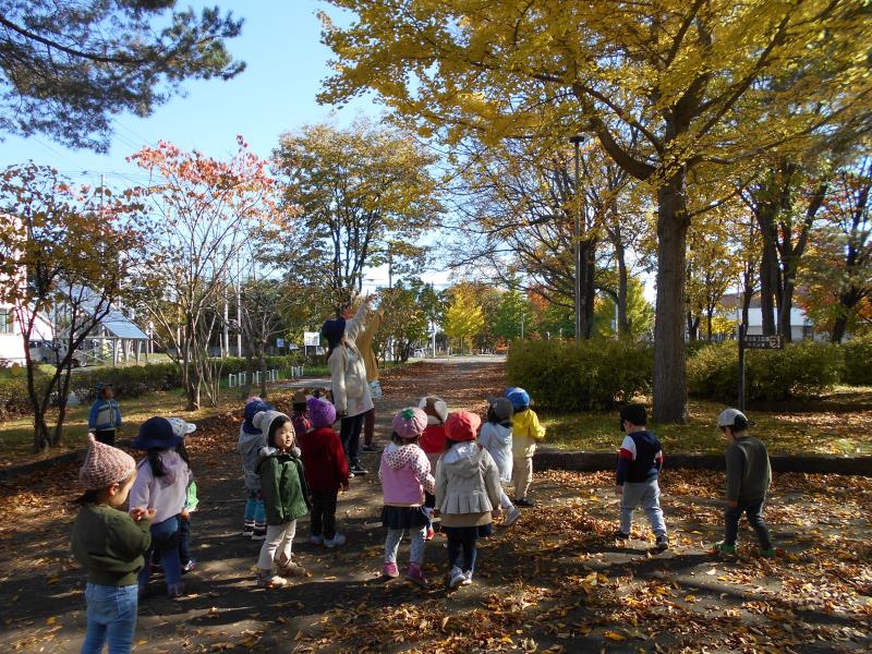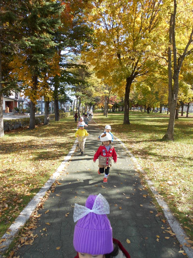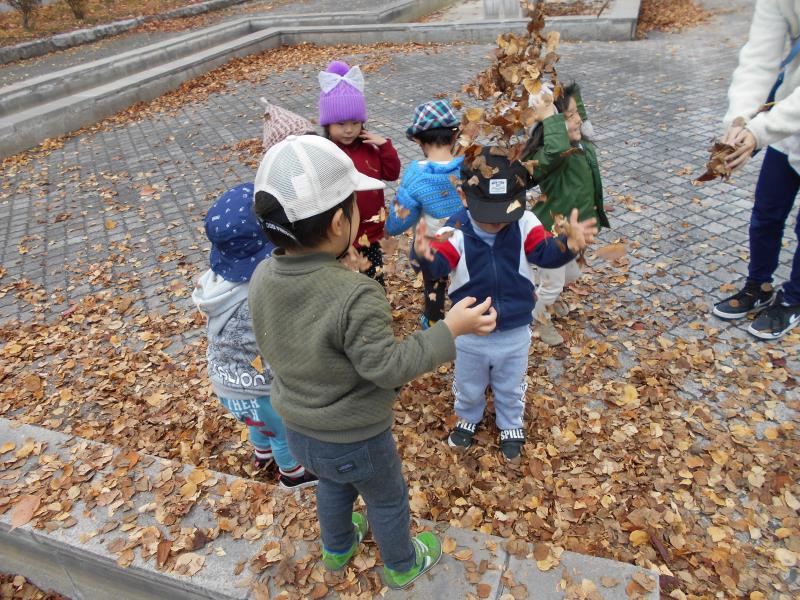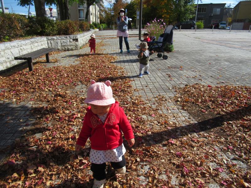 たくさんの落ち葉の上を歩き、カサカサ音が鳴ることを楽しんでいましたよ。