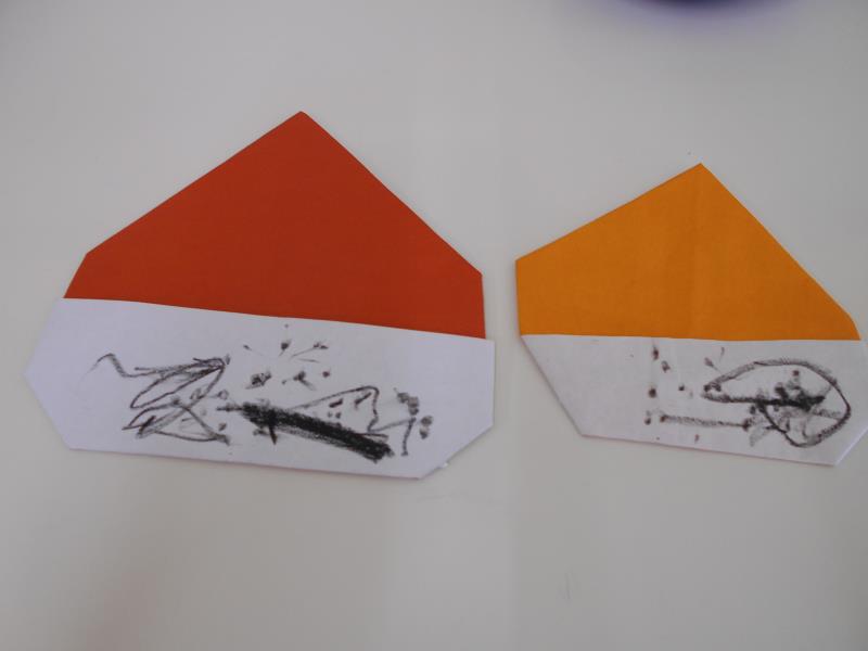 たんぽぽさん、前回折り紙で作った栗にクレヨンで点々を描き、イガに色を塗りました。