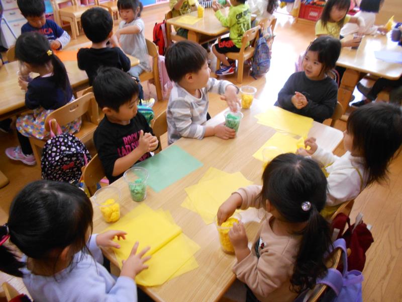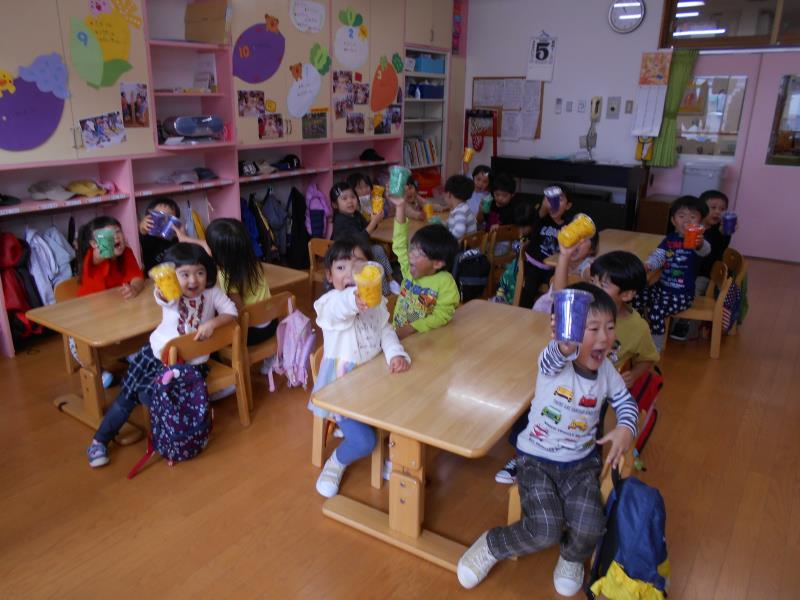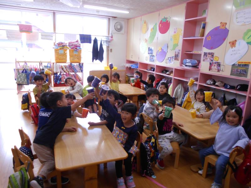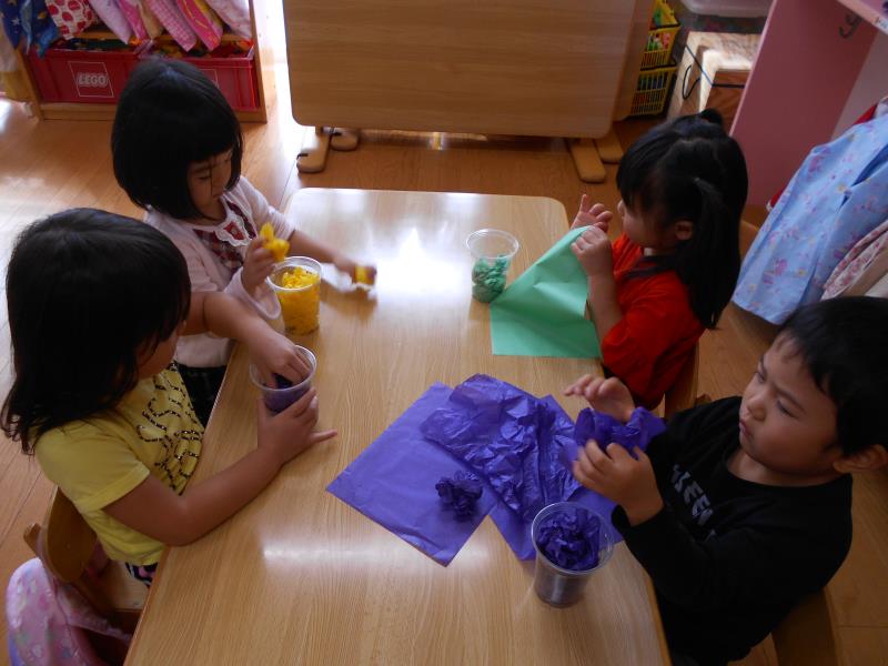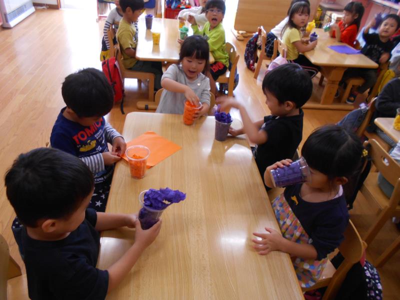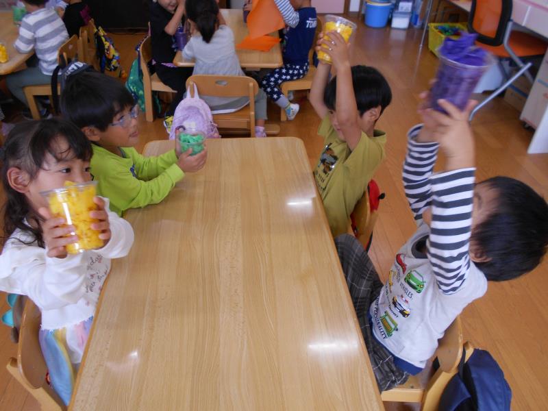 花紙を優しく丸め、コップに入れて…バナナ・メロン・ブドウの美味しそうなジュースが出来上がりました。