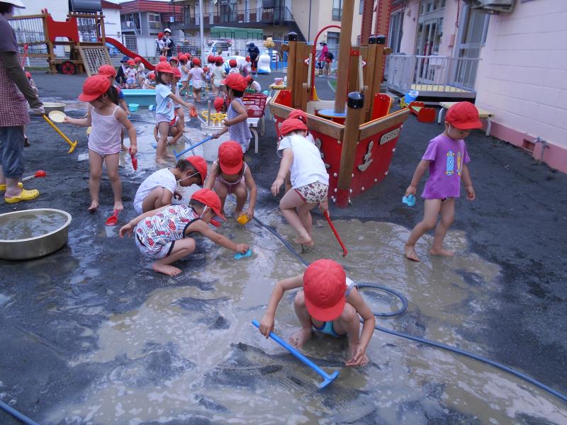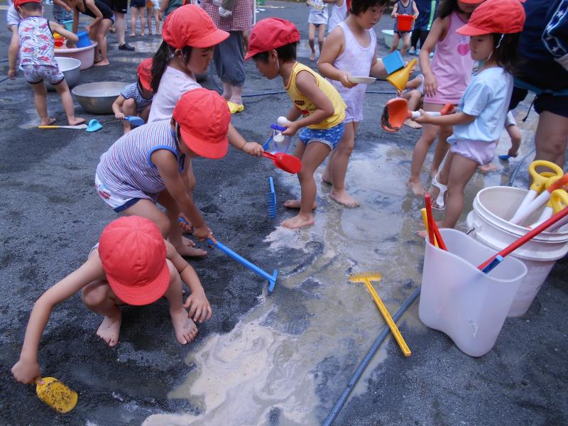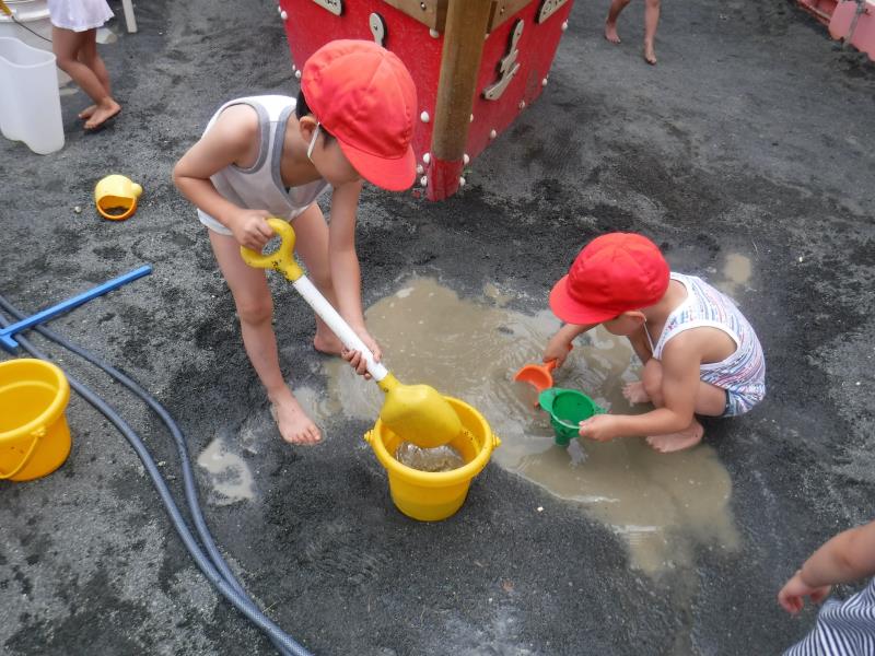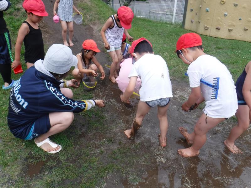 水を流して、泥水あそびのように遊んでいる姿もみられました。