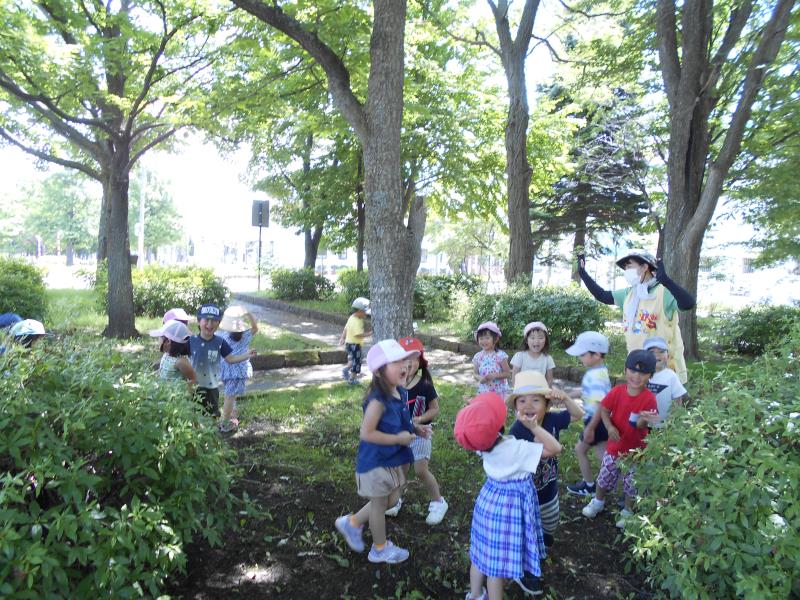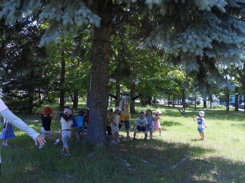 帰りは木陰の中を涼みながら歩き、木の陰に隠れて後から来るお友達を「わぁ~!」と驚かしていましたよ。