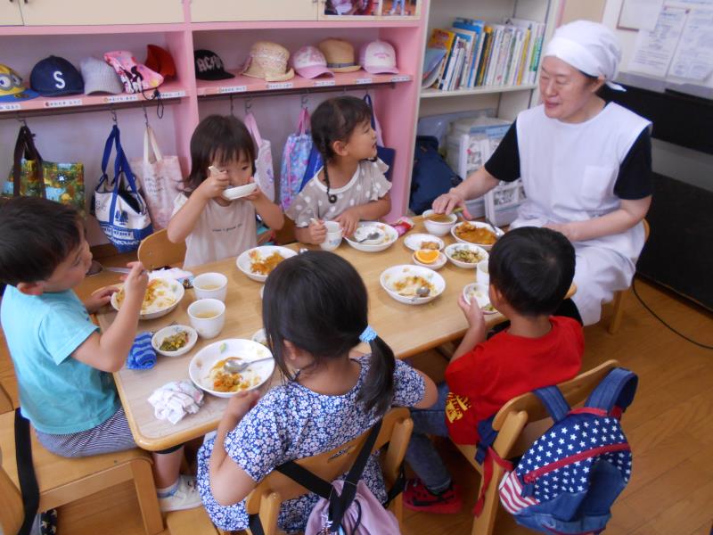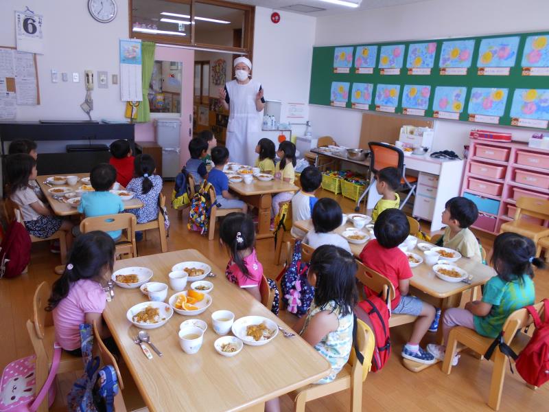お肉や野菜はみんなの体を元気にしてくれることや、スプーンやフォークの持ち方、食事のマナーもお話してくれましたよ。