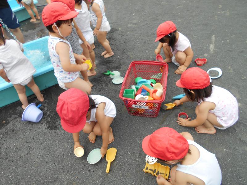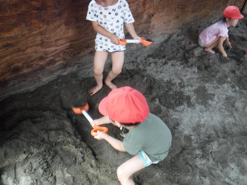 さくらさん、すみれさん、ゆりさんの砂水遊びの様子です。
