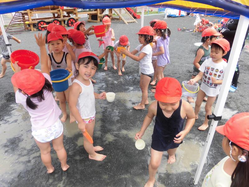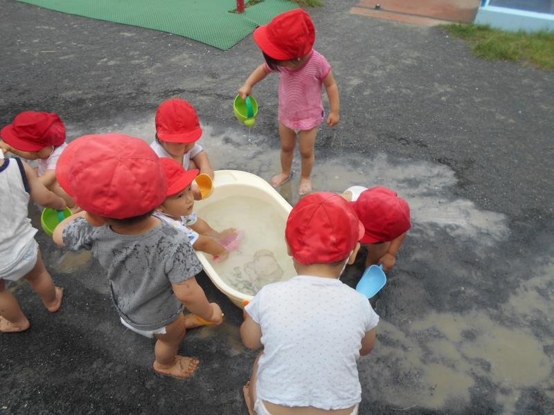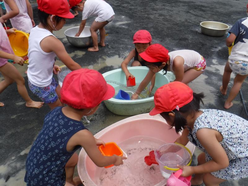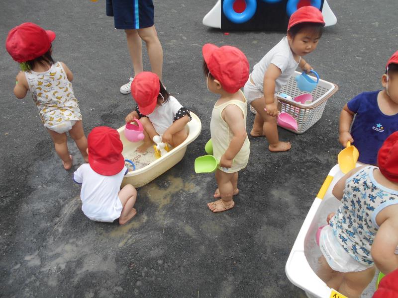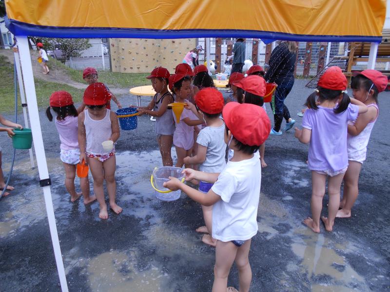 じょうろやバケツを使ってお水を汲み、水にふれながら気持ち良く遊んでいましたよ。