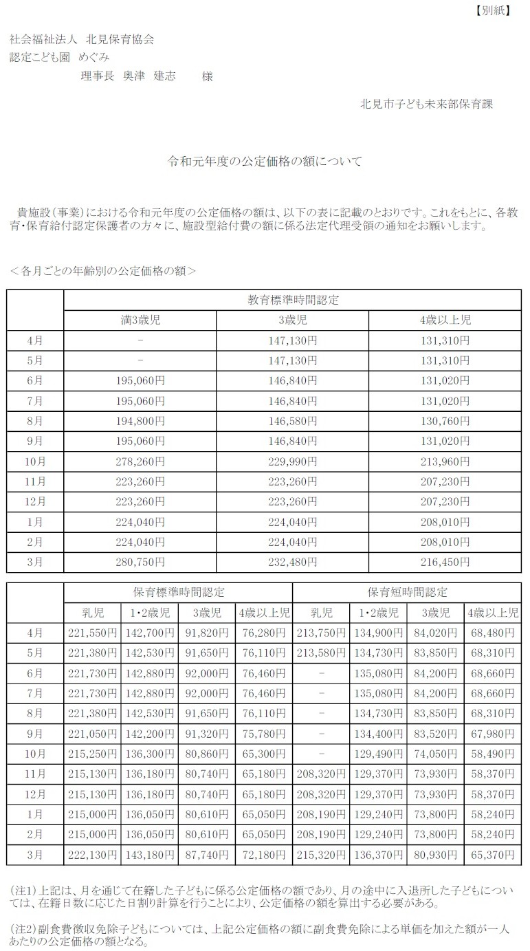 令和元年度、本園が代理受領した施設型給付費等の額は、各教育・保育給付認定保護者について、「本園に係る各教育・保育給付認定子どもの公定価格の額(別紙〔下の画像〕参照)から、各教育・保育給付認定保護者に係る利用者負担額を減じた額」となります。具体の額をお知りになりたい場合は、お手数ですが、個別に園までお問い合わせいただければと思います。