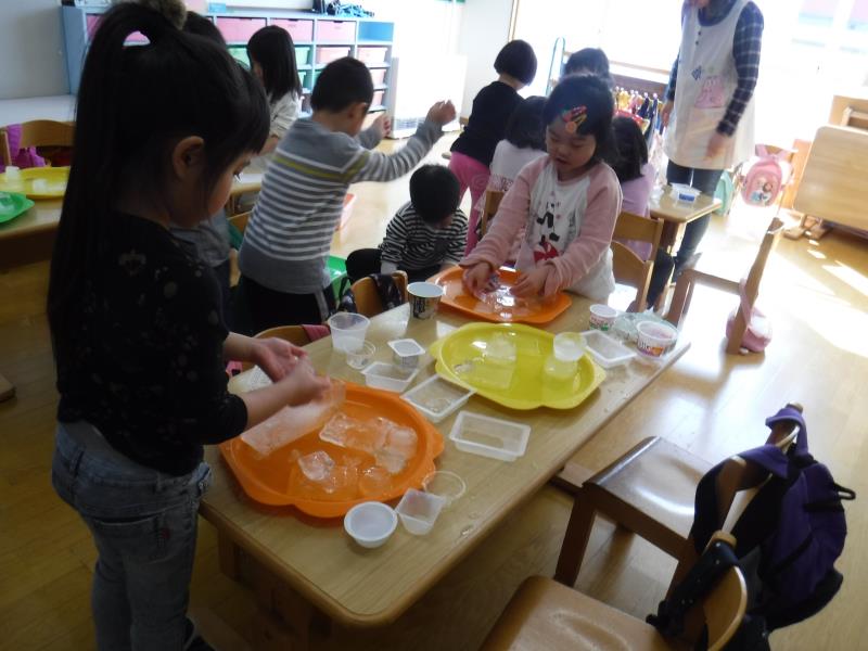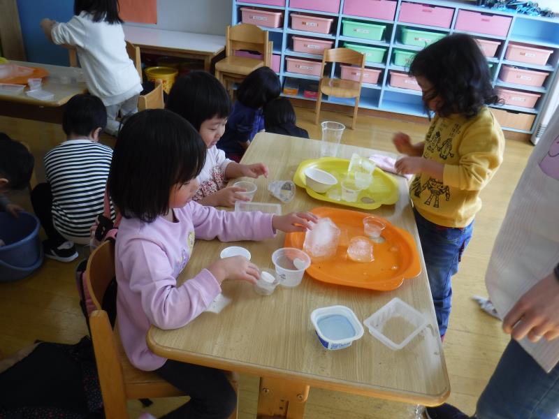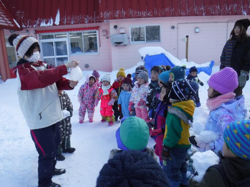 途中、もも組さんから風船氷を分けてもらい、どうなっているのか想像しながら先生が割ってみました。