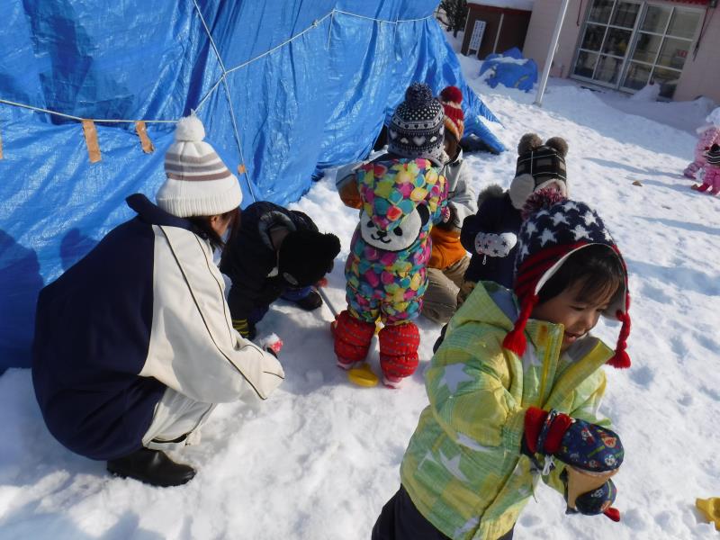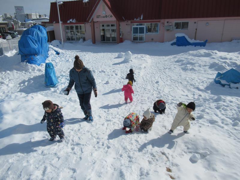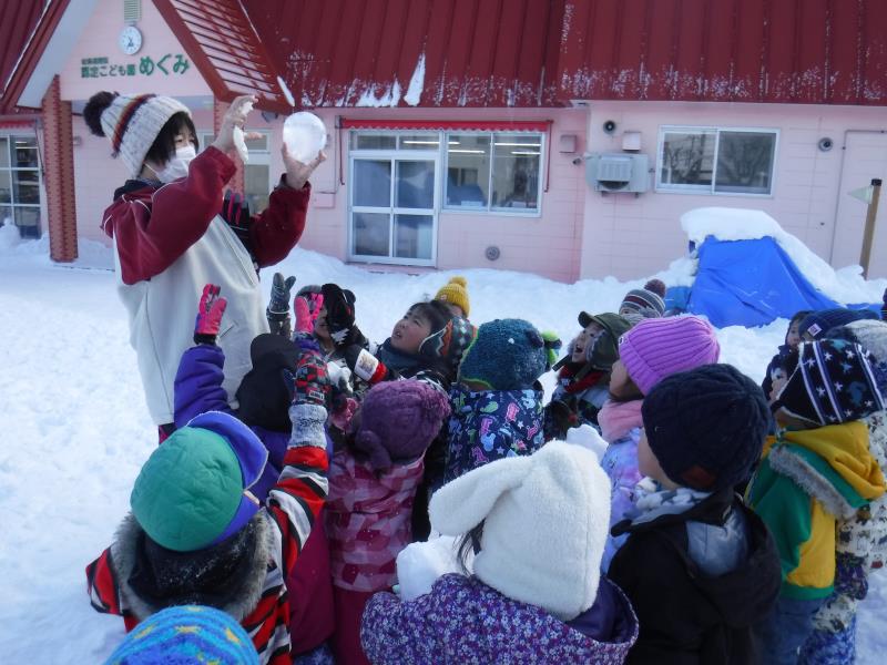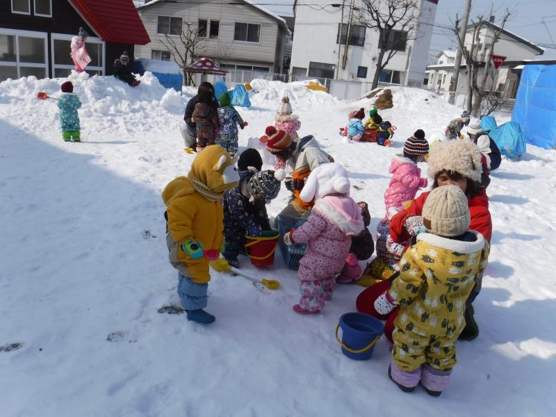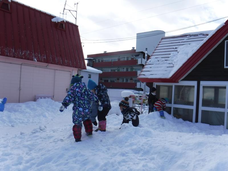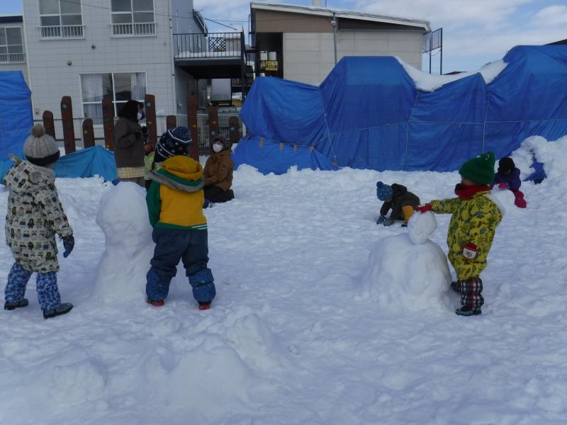 ちゅうりっぷさんとたんぽぽさん、園庭で雪遊びをしました。
