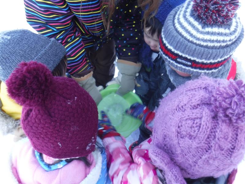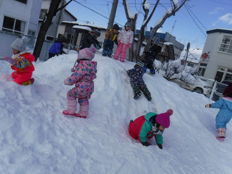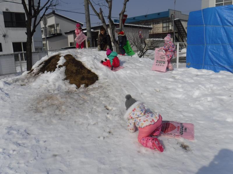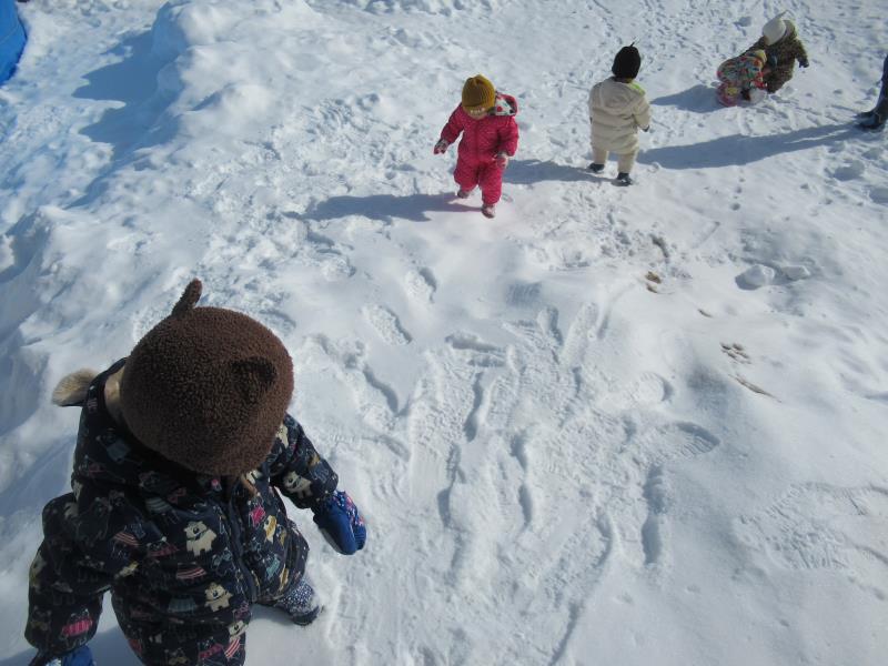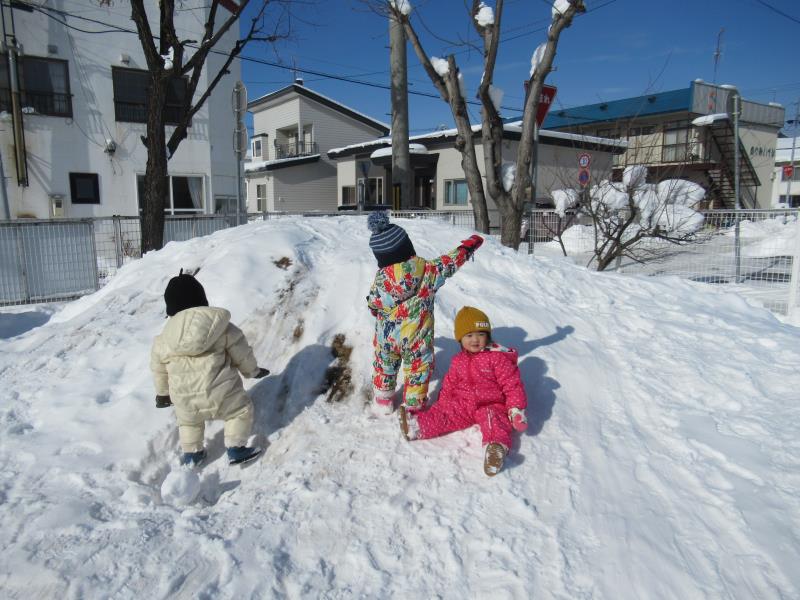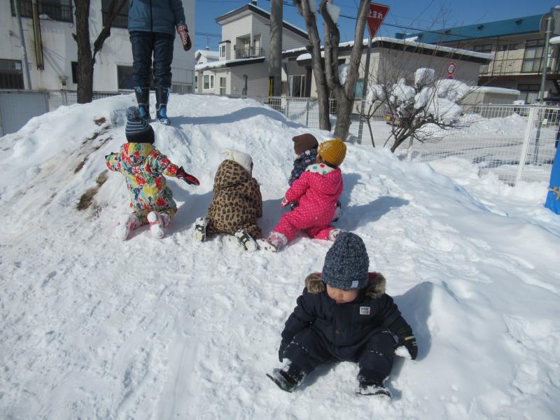 お山からのおしり滑りや、雪の塊と氷を見つけて遊んでいました。