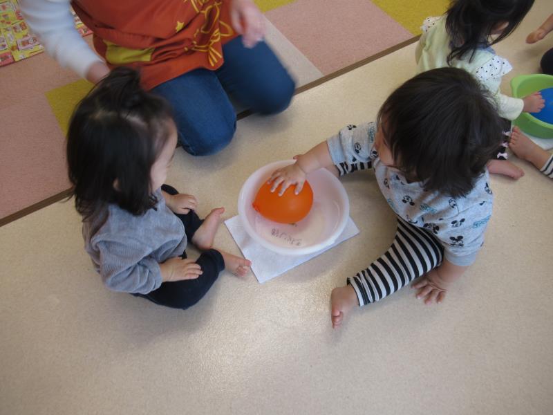 もも組さん、水を入れて凍らせていた風船を割ってみました。